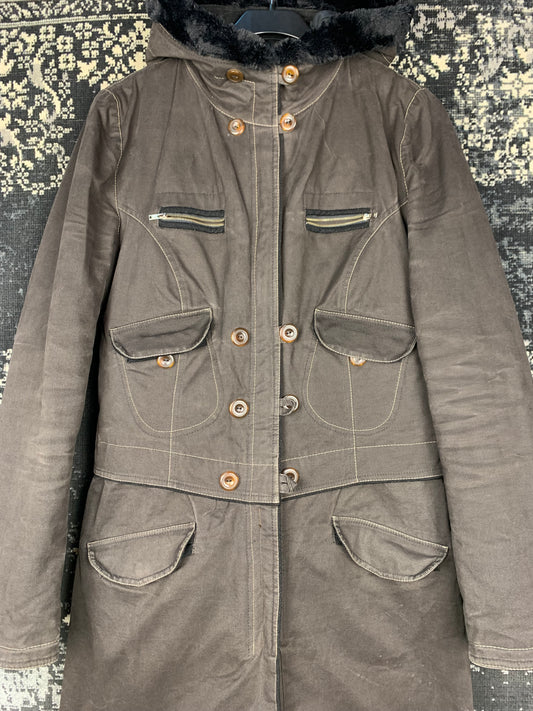 Y2K Style Brown Long Utility Coat for Women with Faux Fur Hood