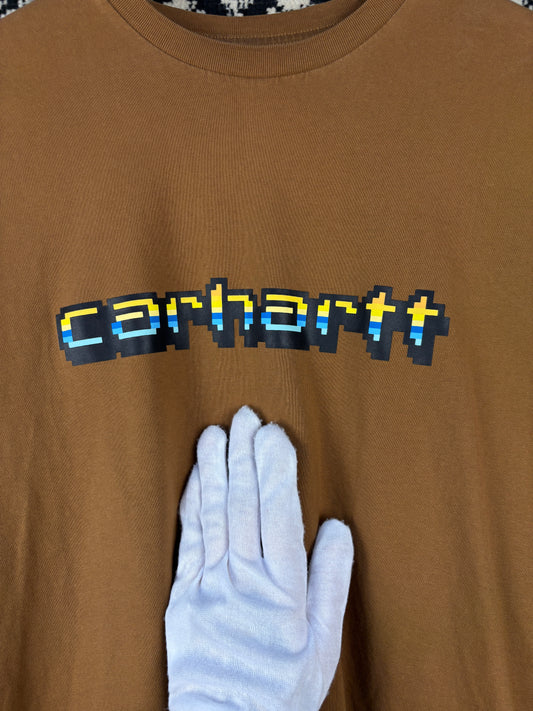 Mens Y2K Brown Carhartt Work In Progress Pixel Logo Graphic T Shirt