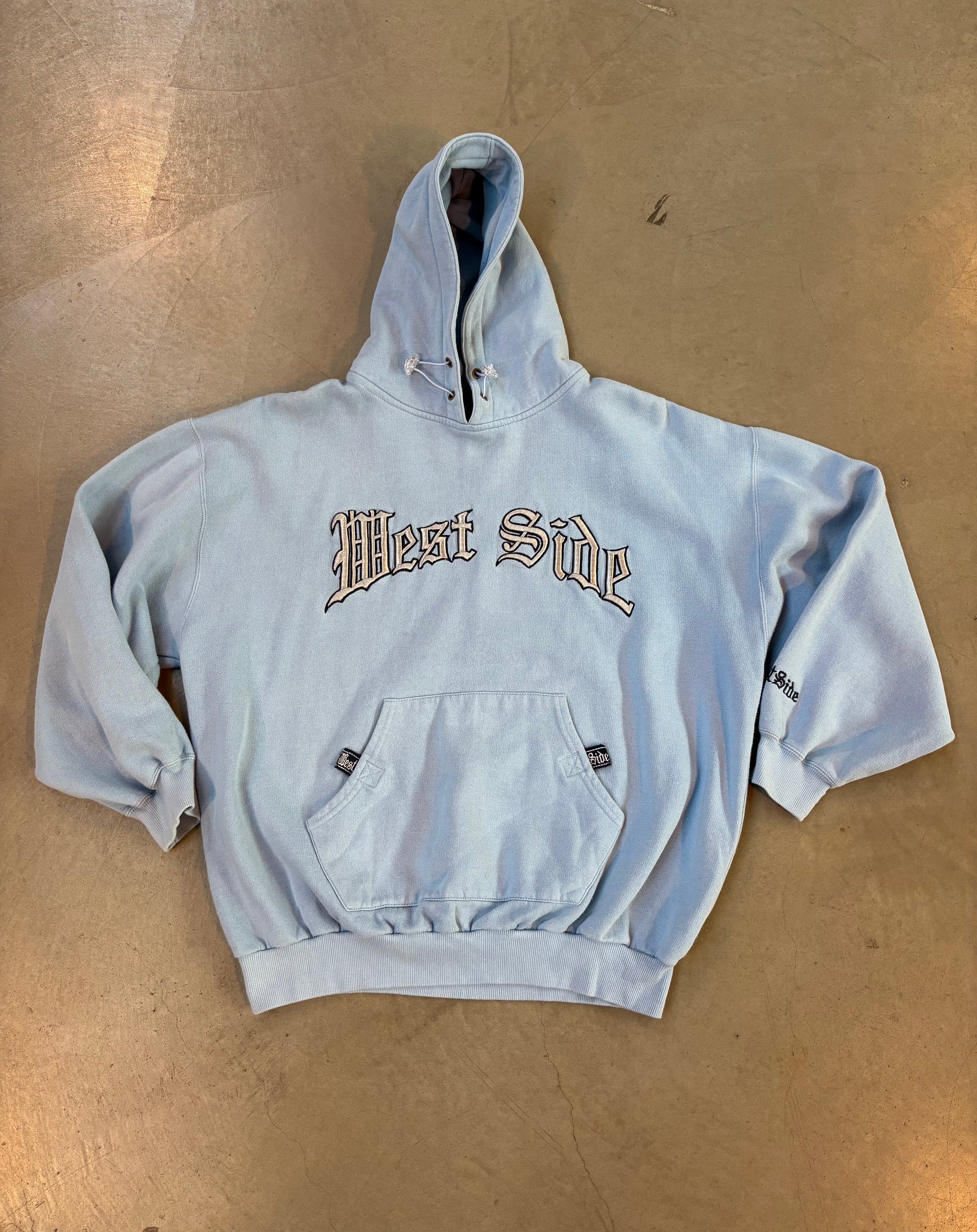 West Side Blue Hoodie Men’s L XL Vintage Streetwear Pullover Embroidered Hip Hop Urban Sweatshirt Bold Letter Hooded Top Retro Style