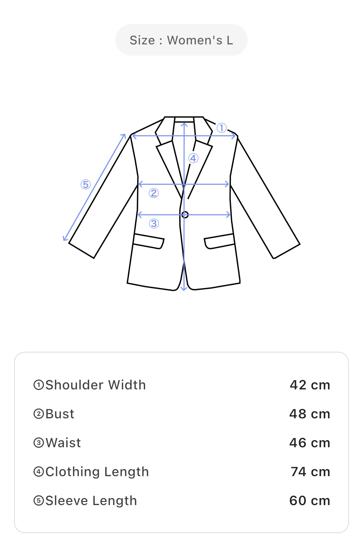 Size: Women’s L, Shoulder Width: 42 cm, Bust: 48 cm, Waist: 46 cm, Clothing Length: 74 cm, Sleeve Length: 60 cm