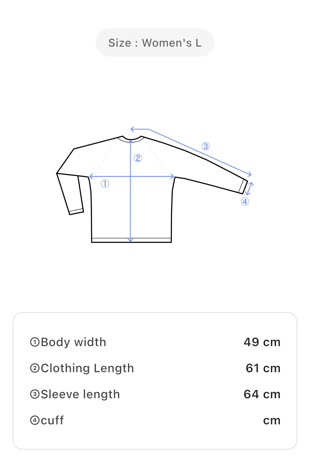 • Size: Unisex L — body width: 49 cm, clothing length: 61 cm, sleeve length: 64 cm