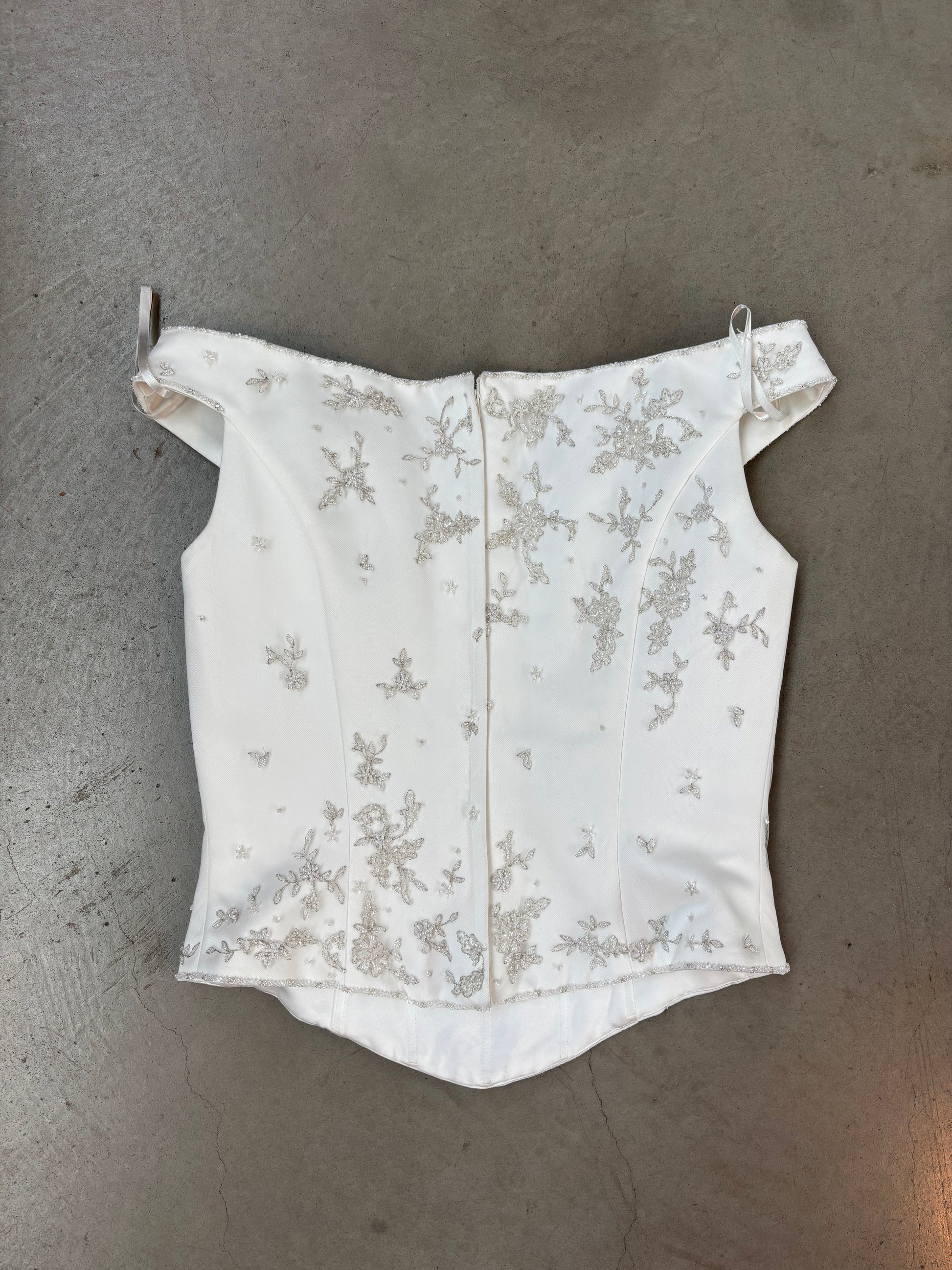 Elegant White Beaded Corset Top Women’s XS Off Shoulder Formal Strap Top with Floral Embroidery and Back Zip