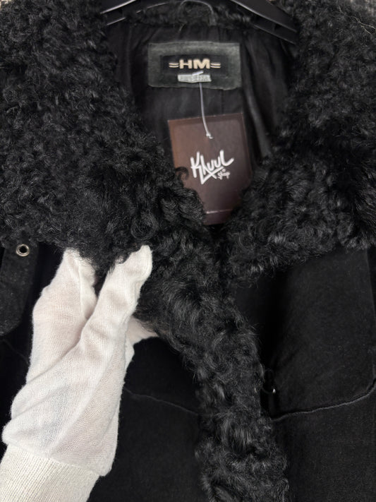 Women's Y2K Vintage Black Suede Coat with Genuine Goat Fur Trim