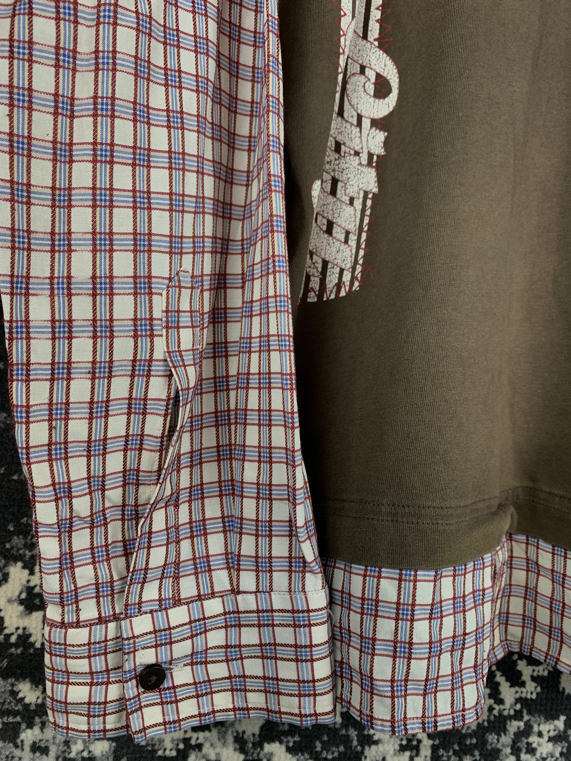 Men's Y2K Clockhouse Distressed Long Sleeve Polo With Plaid Collar – XXL – Brown Graphic Shirt with Yellow Patch & Plaid Trim