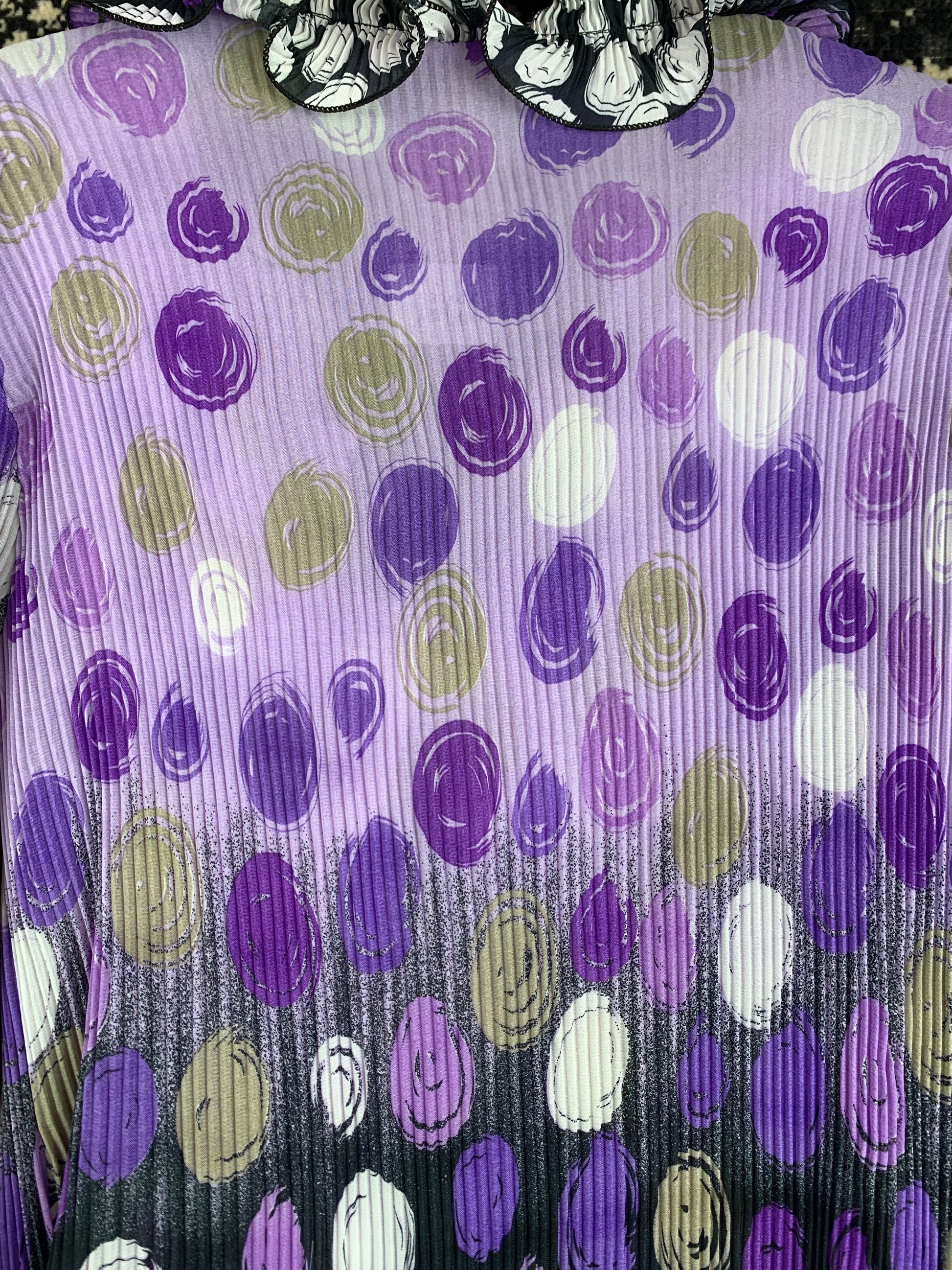 Retro Funky Ruffle Blouse – Purple Pleated Polka Dot Print