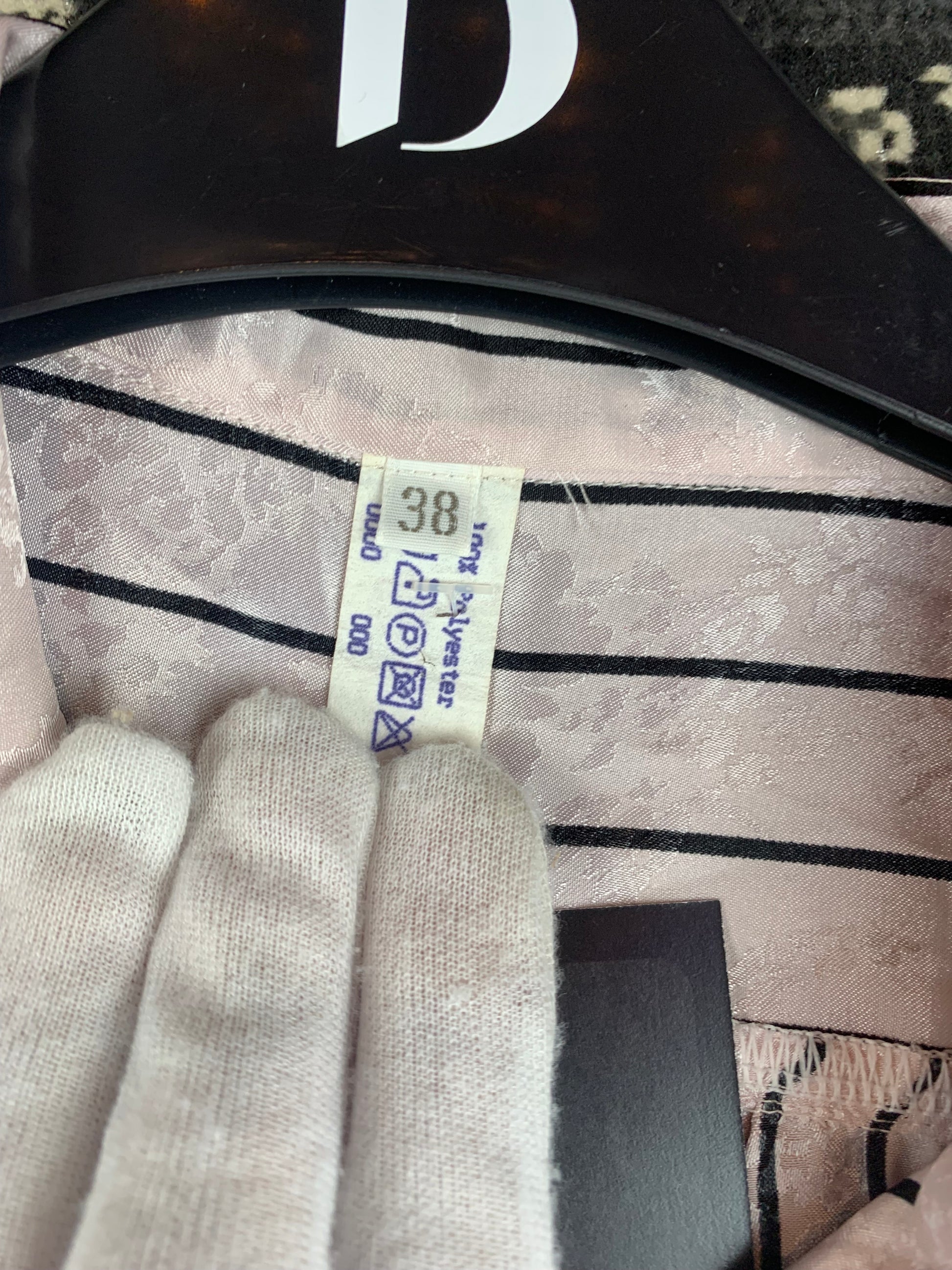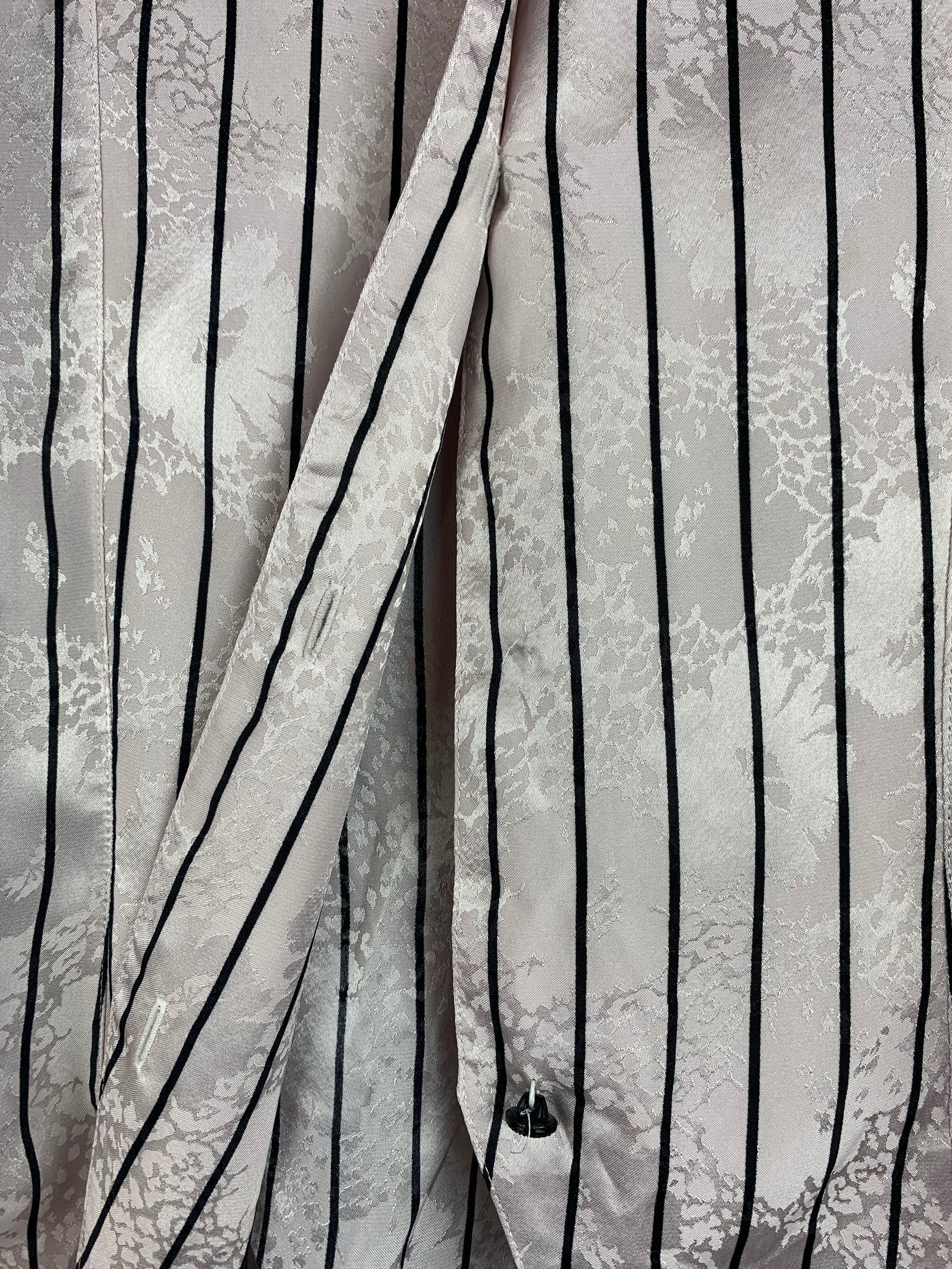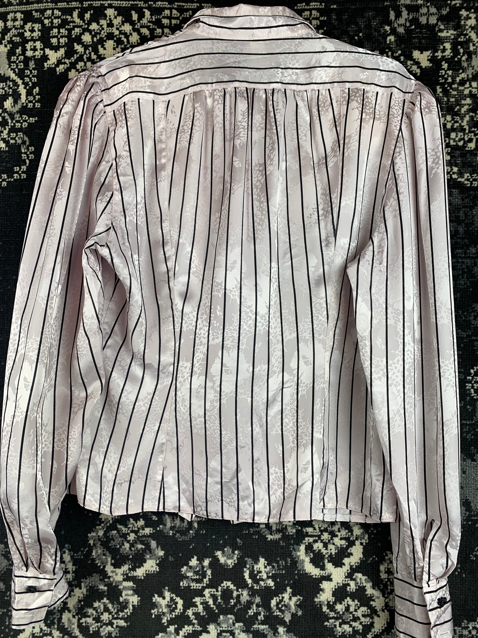 Vintage Satin Striped Button-Up Shirt – Subtle Floral Jacquard Texture – Puff Long Sleeves with Cuffs – Classic Collar – Women’s M (EU 38)