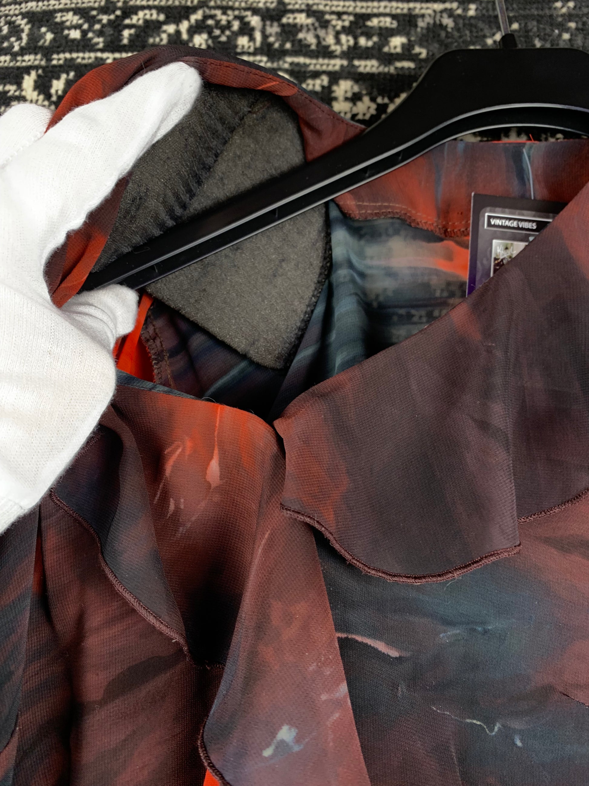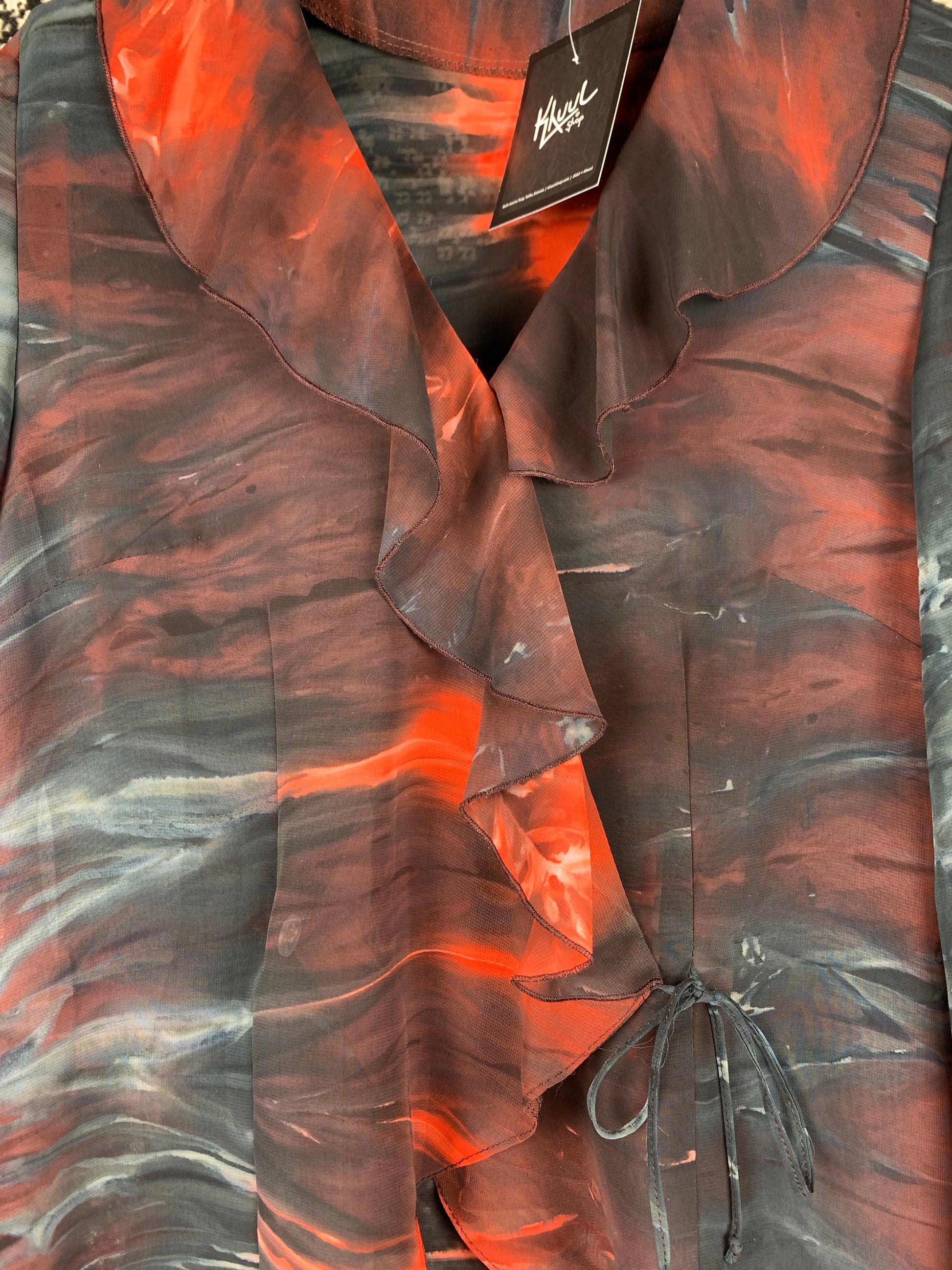 Women's Vintage Ruffle Tie Front Blouse – Abstract Marble Print – Flared Sleeves – Retro Mesh Top – L Size