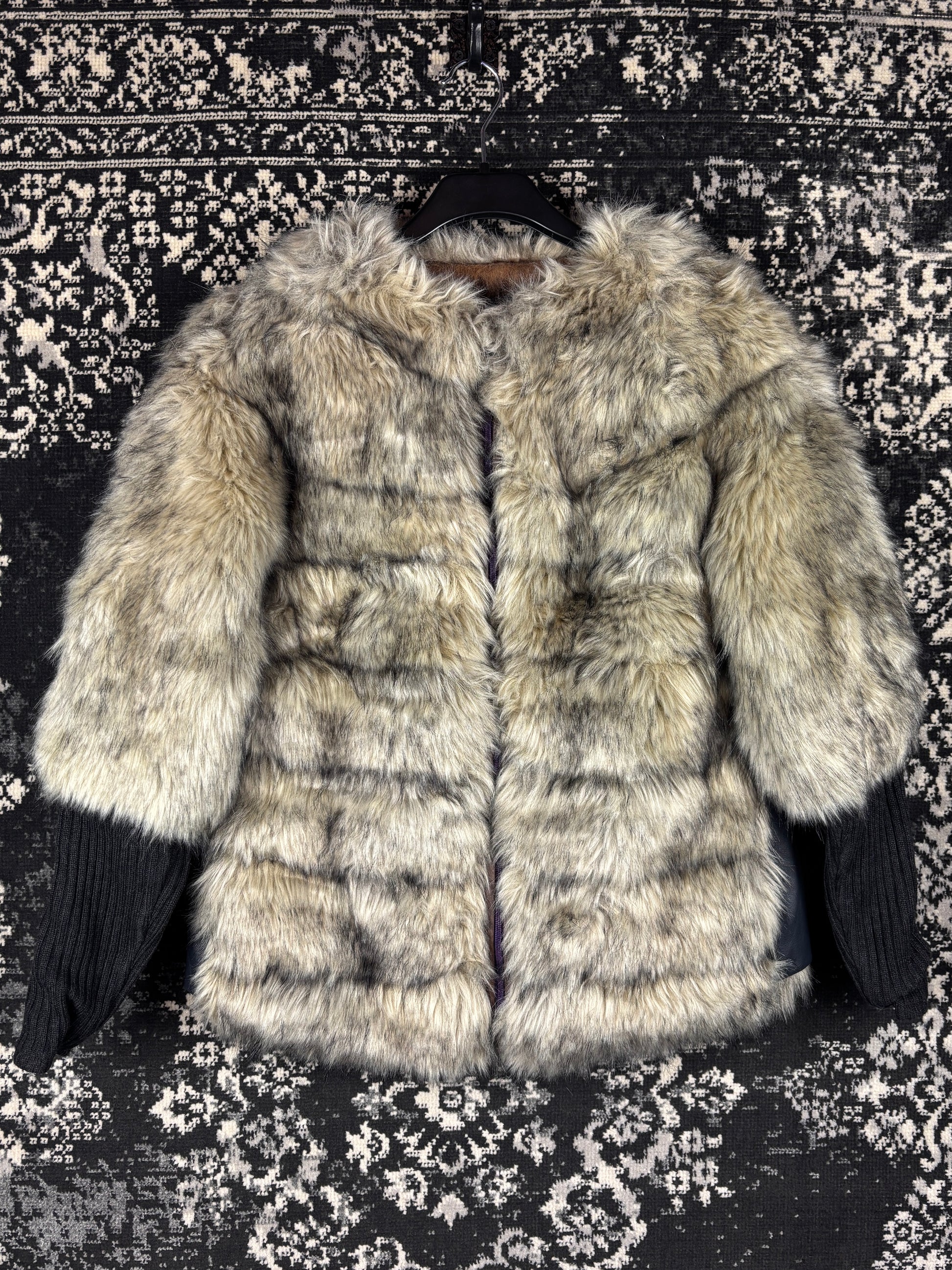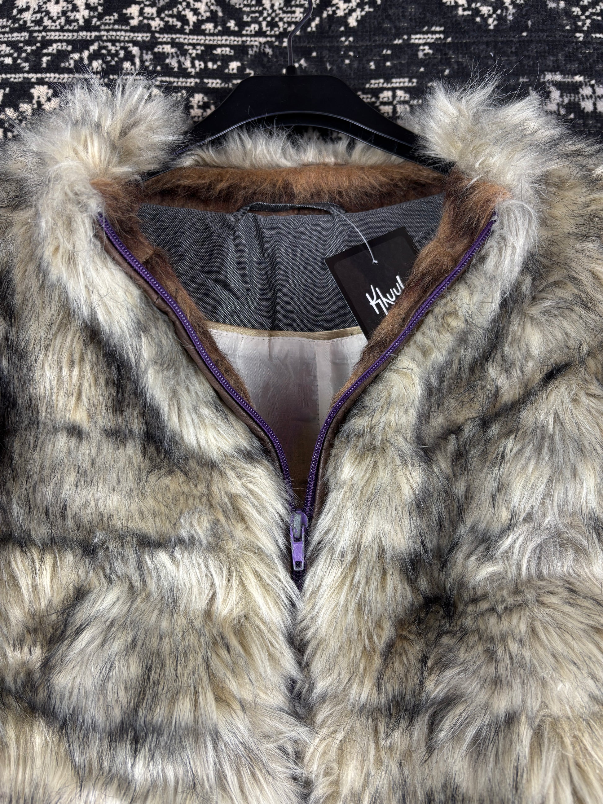 Color: Light brown and cream mixed faux fur with black ribbed sleeves and purple zip detail