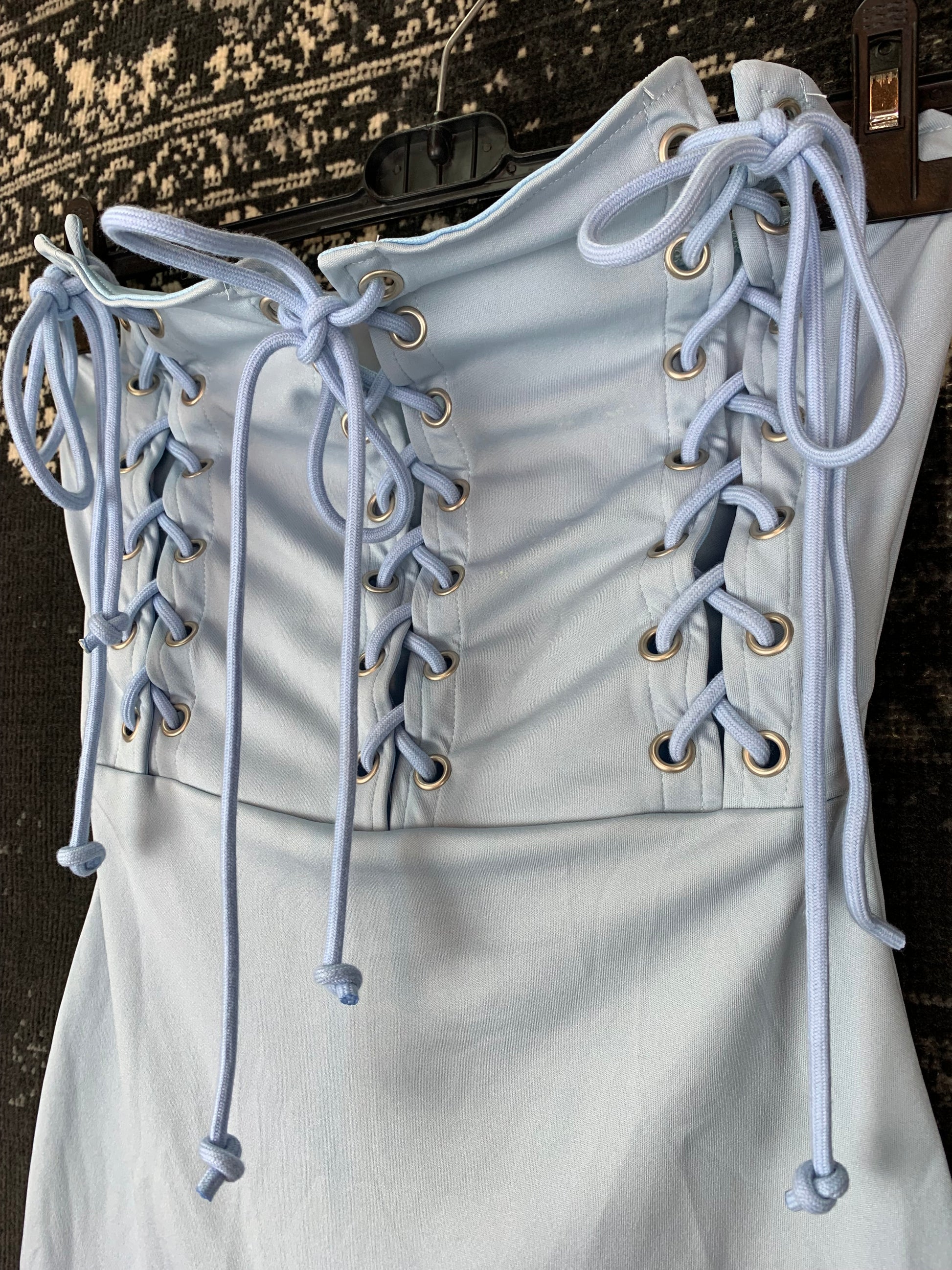 Y2K Women’s Light Blue Lace-Up Bodycon Mini Dress – Strapless – Corset Front – Sleeveless Clubwear – XXS