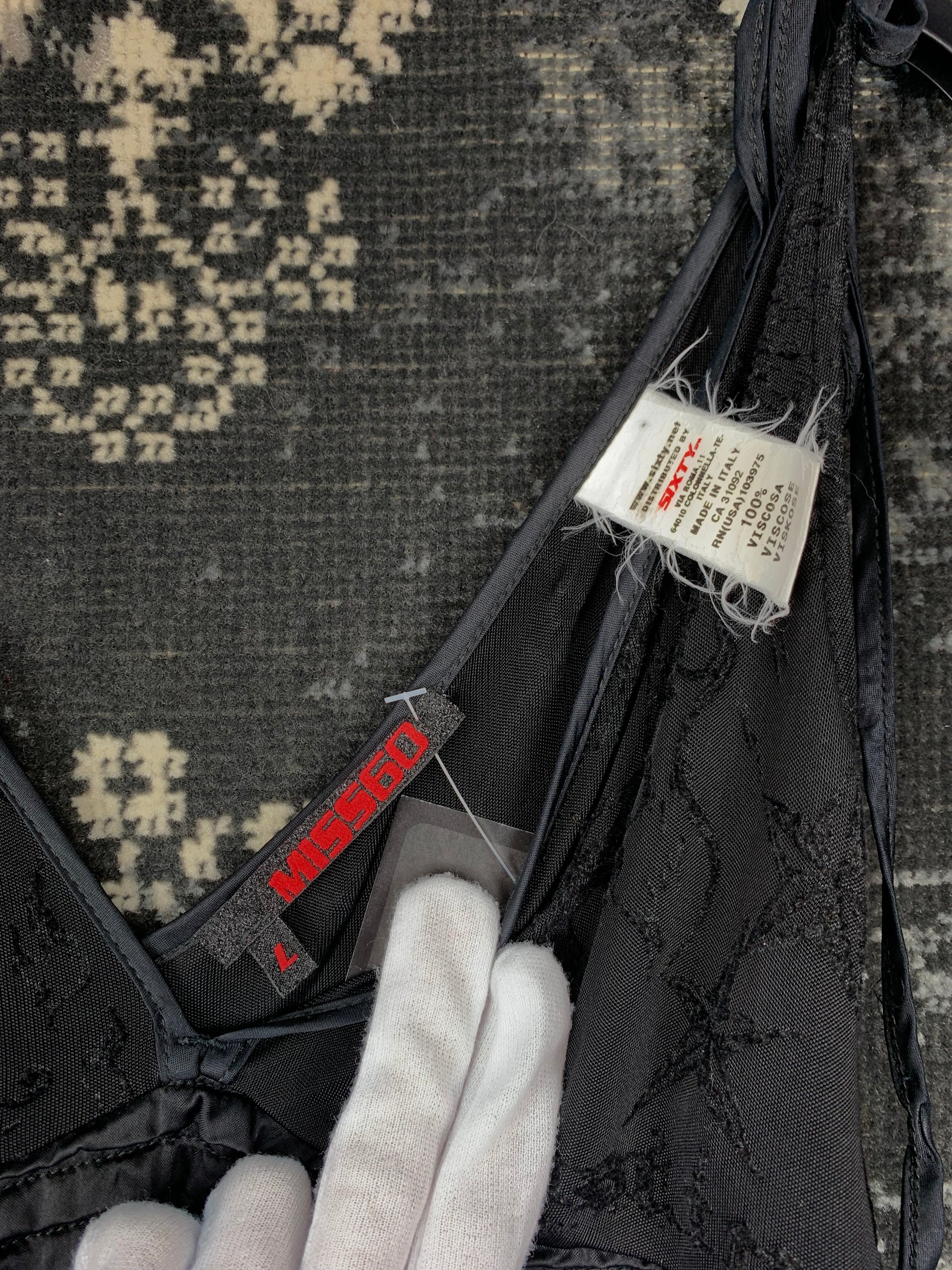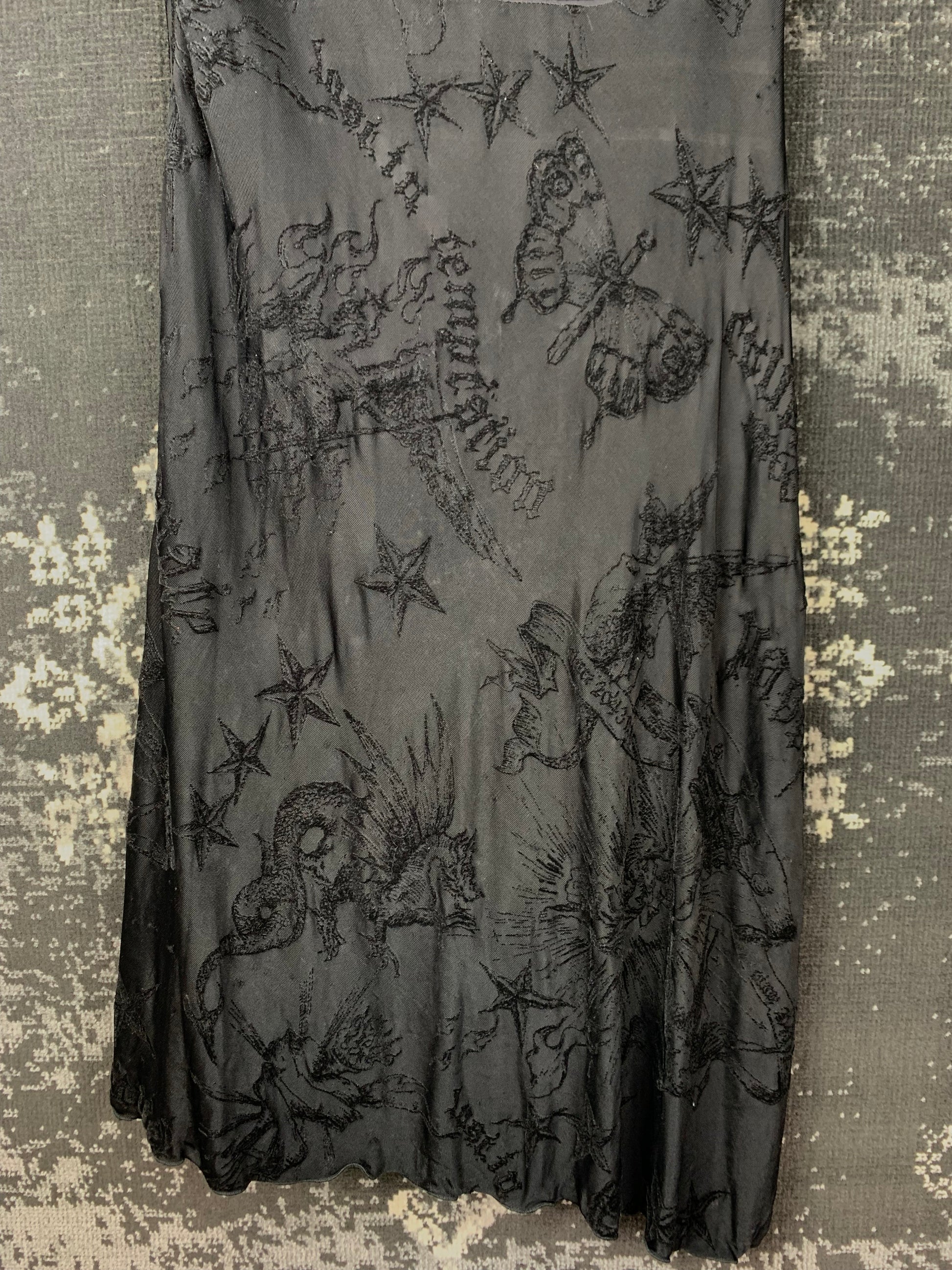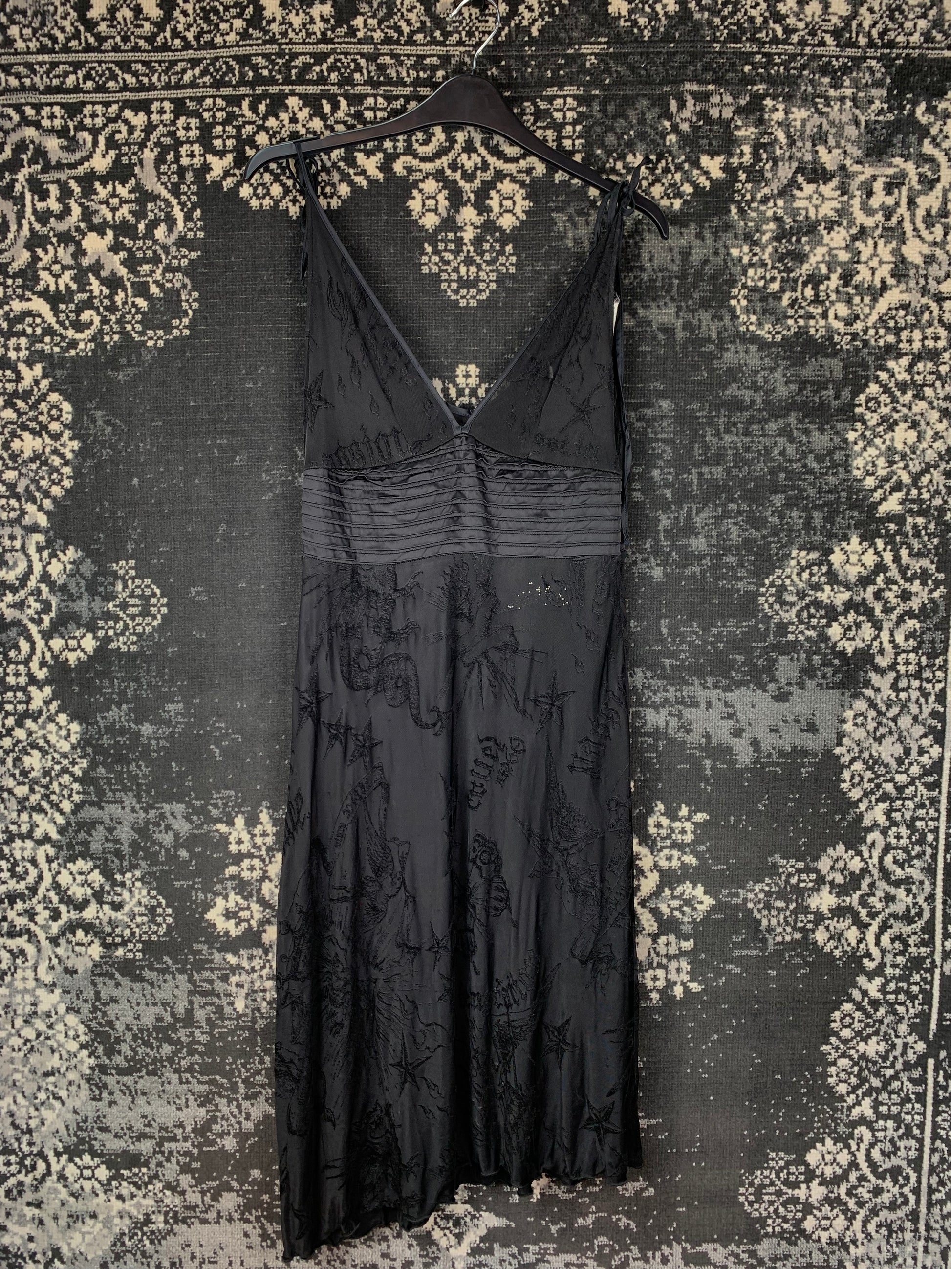 Y2K Women's Black Miss Sixty Dress – Embroidered Gothic Mesh Slip – V-Neck – Adjustable Straps – Size L – Partywear Look