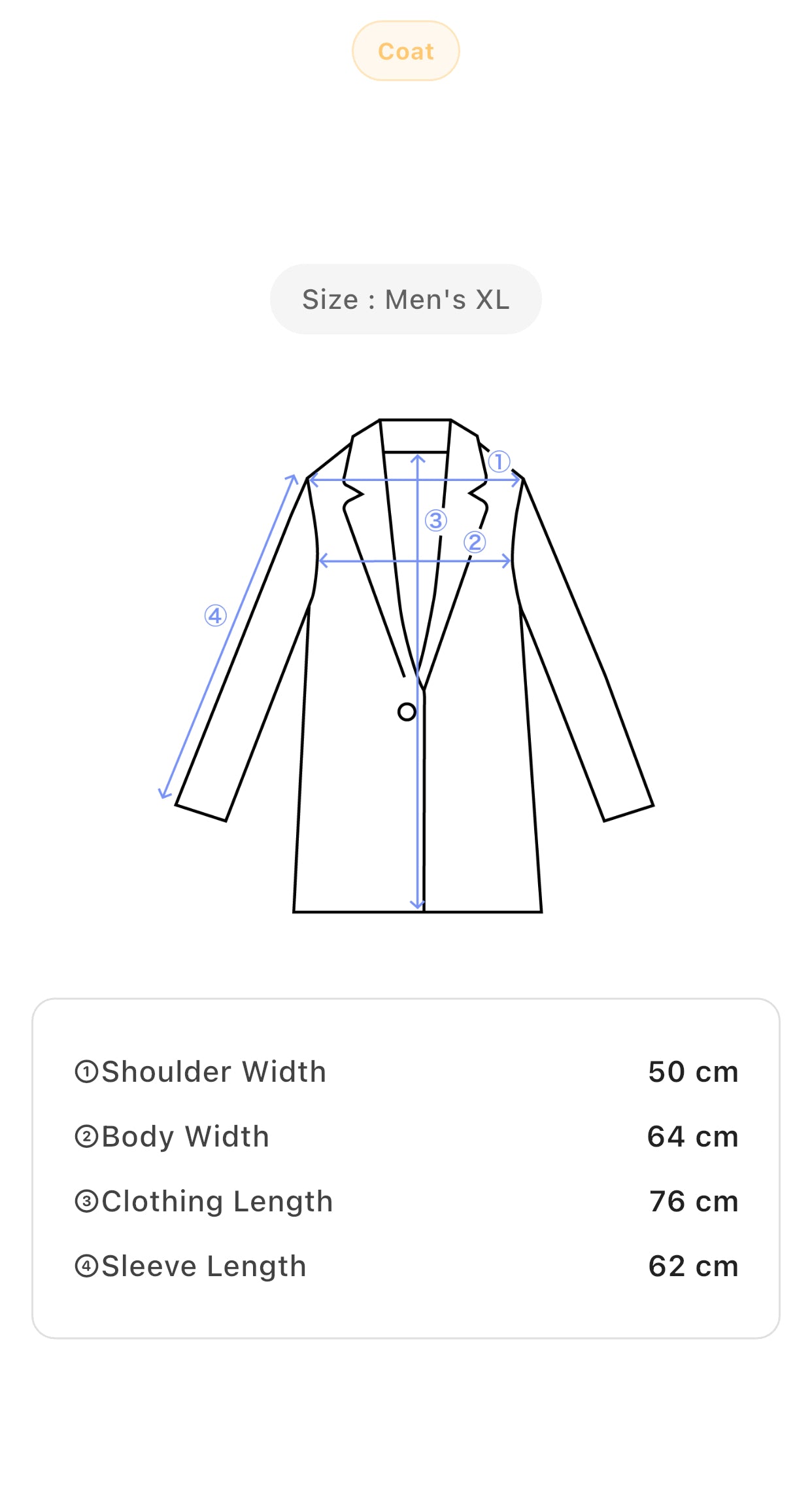 • Size: Men’s XL, Shoulder Width 50 cm, Body Width 64 cm, Clothing Length 76 cm, Sleeve Length 62 cm