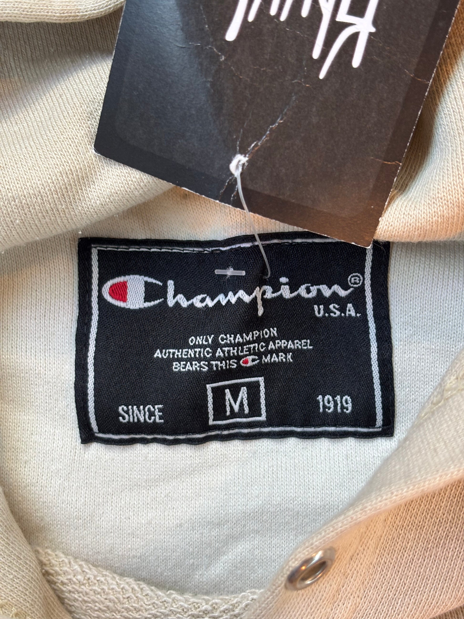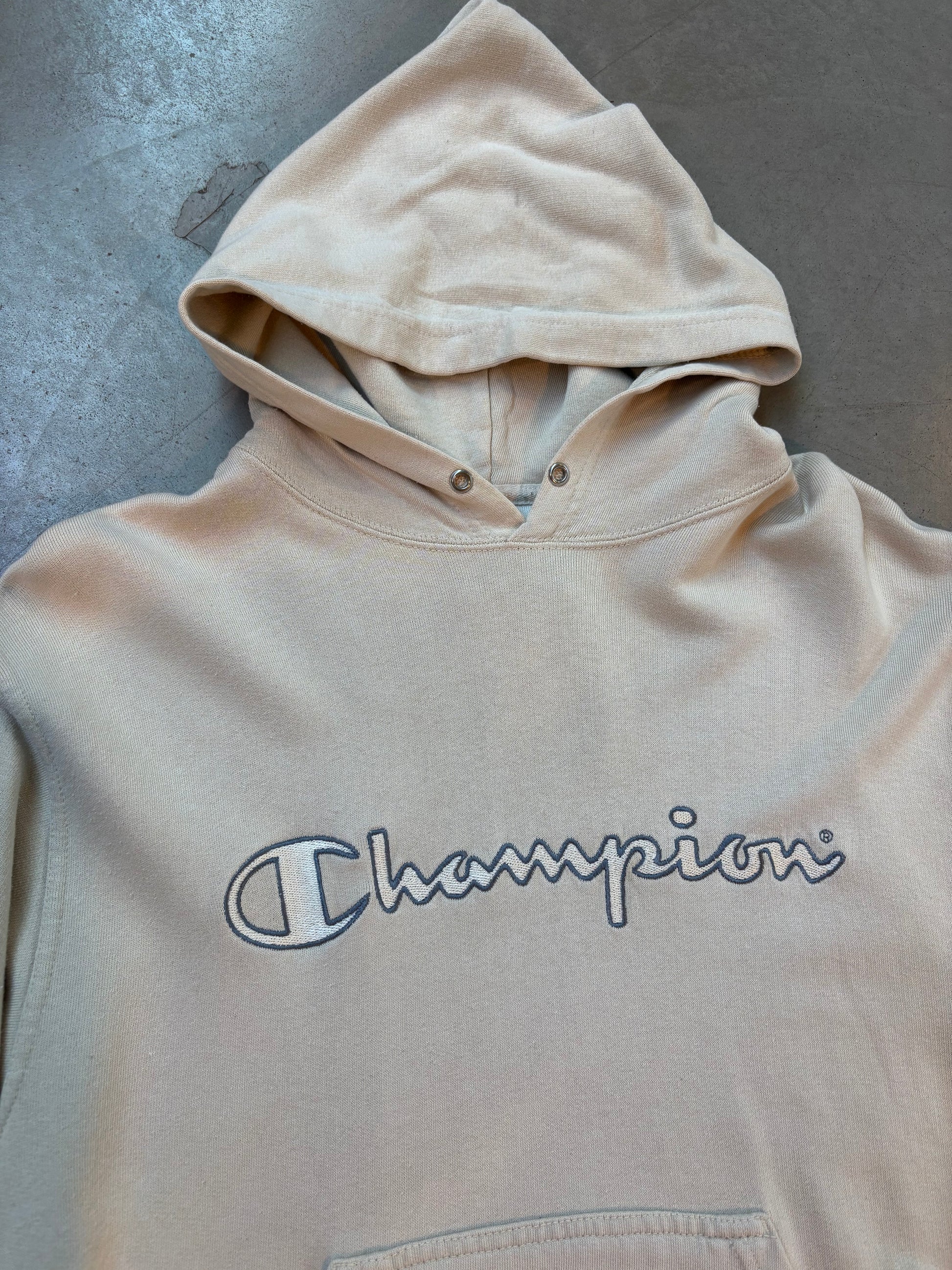 Champion Beige Hoodie Sweatshirt, Men’s Medium, Classic Logo, Cozy Streetwear Pullover, Vintage Athletic Casual Wear