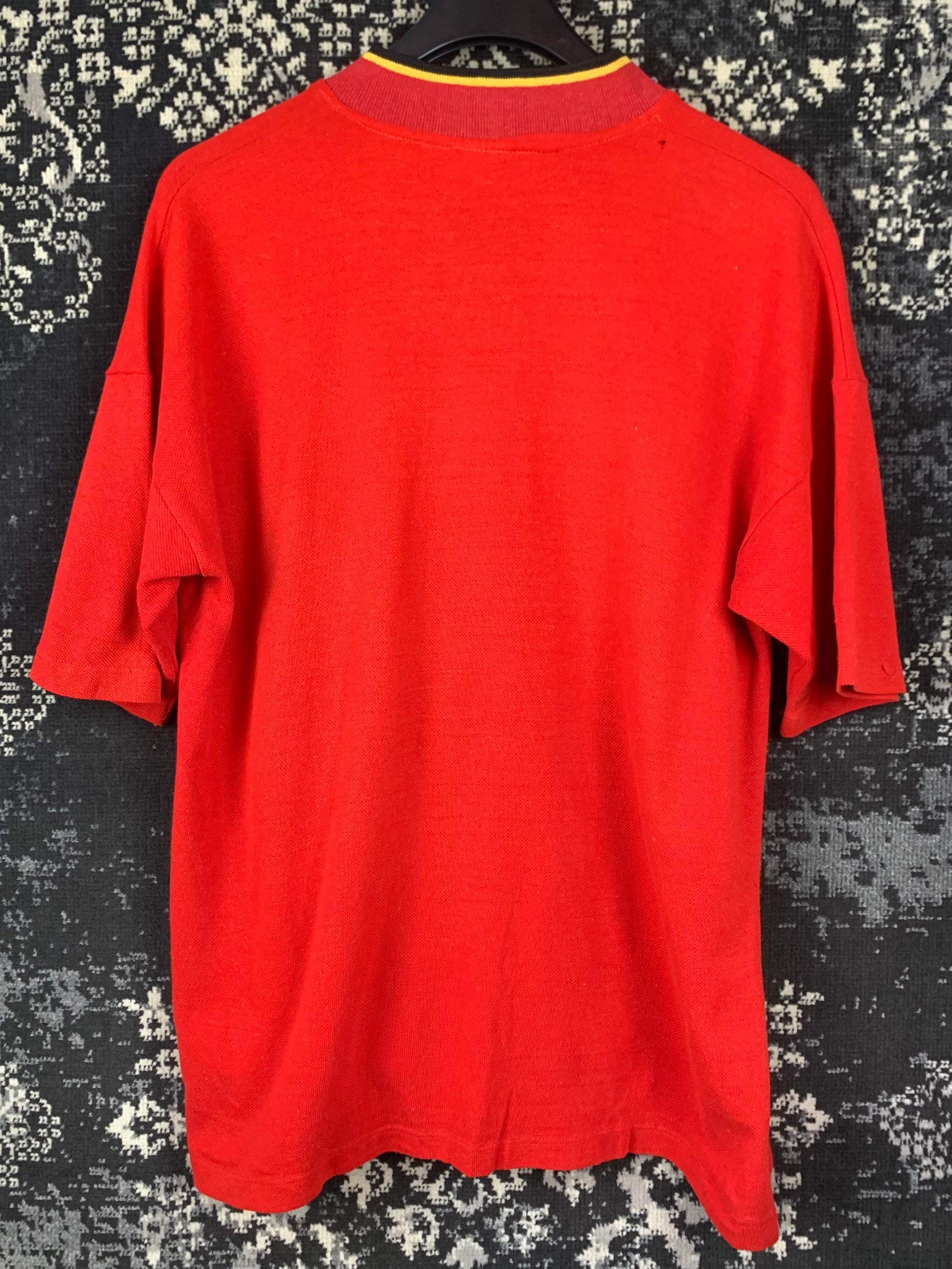 Men's Vintage Nike Red Sports Shirt with Yellow Embroidered Swoosh - Retro Oversized XL Tee for Streetwear or Training Look