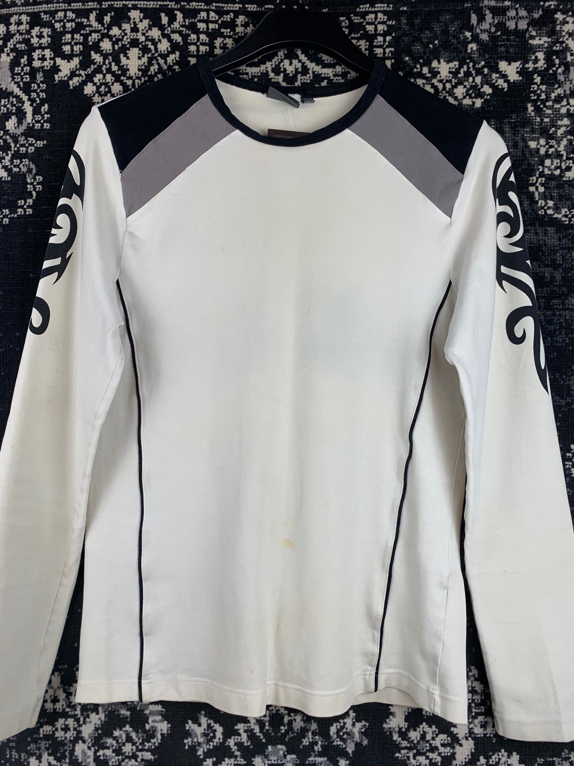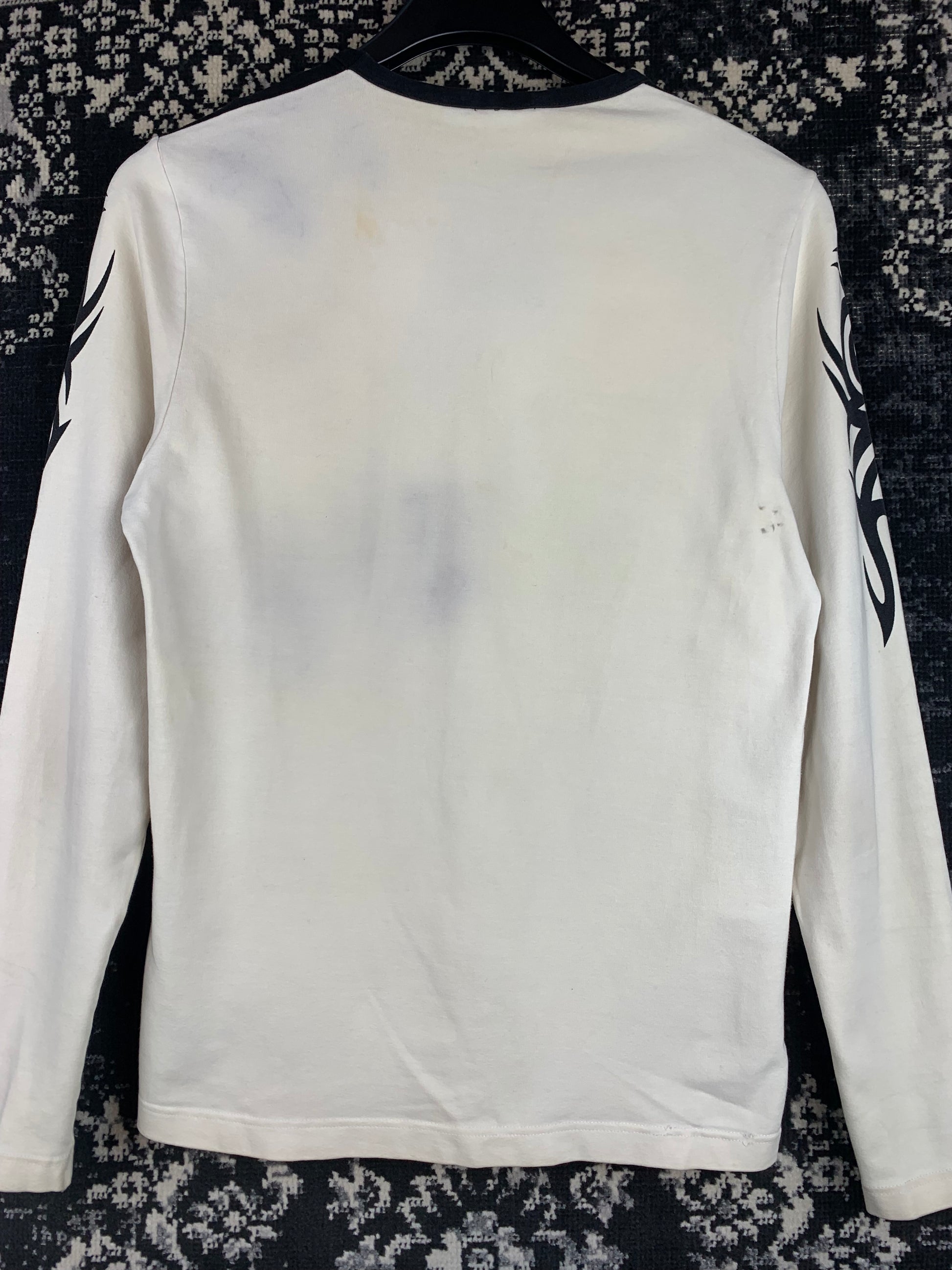 Y2K Tribal Graphic Long Sleeve Shirt - White Fitted Men's Top with Black Tattoo Sleeve Print & Shoulder Panel Stitching Style
