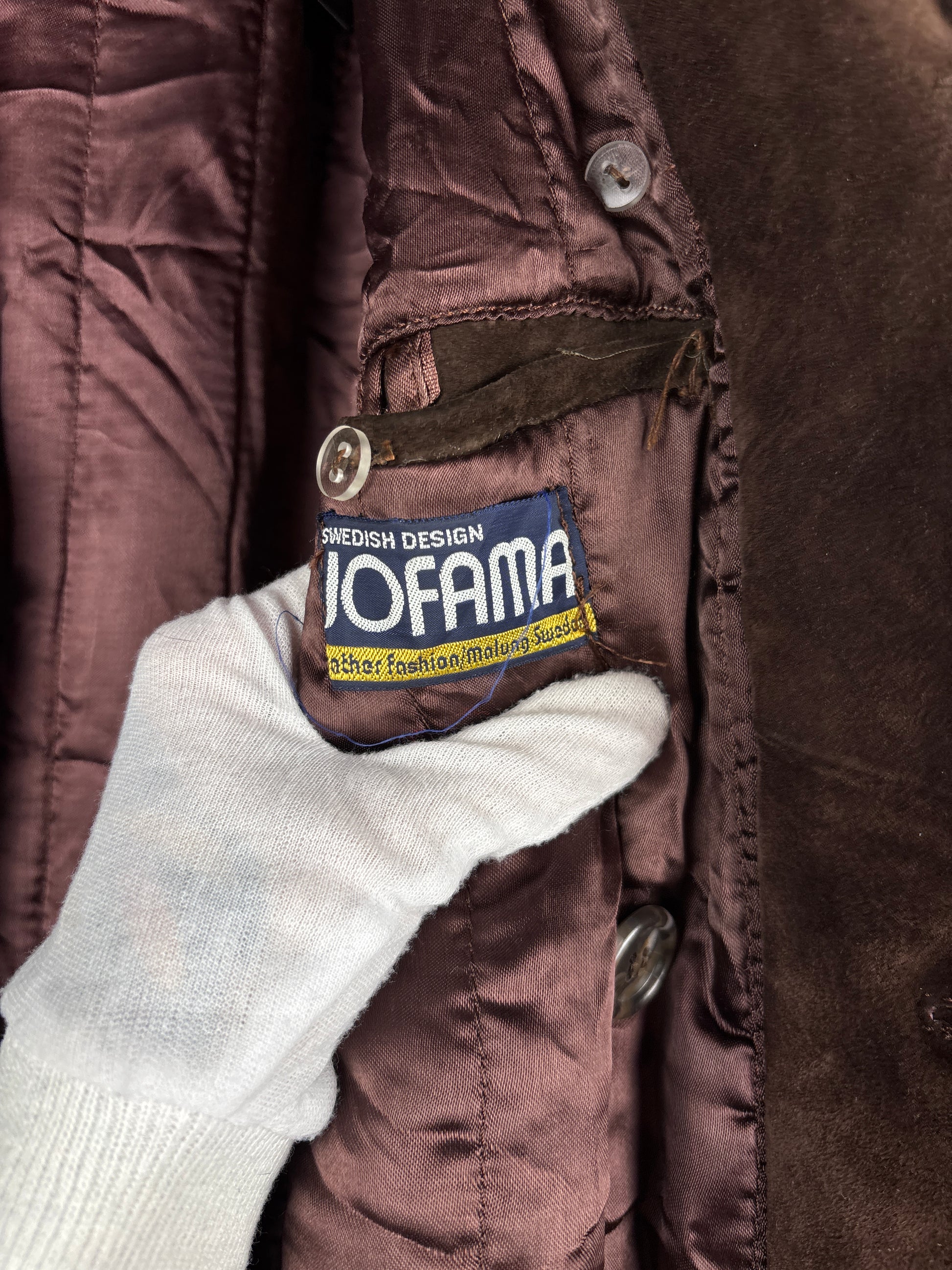 Unisex Vintage Dark Brown Suede Coat with Faux Fur Trim Collar and Belted Back – Double-Breasted Swedish Design by Jofama – Unisex XL