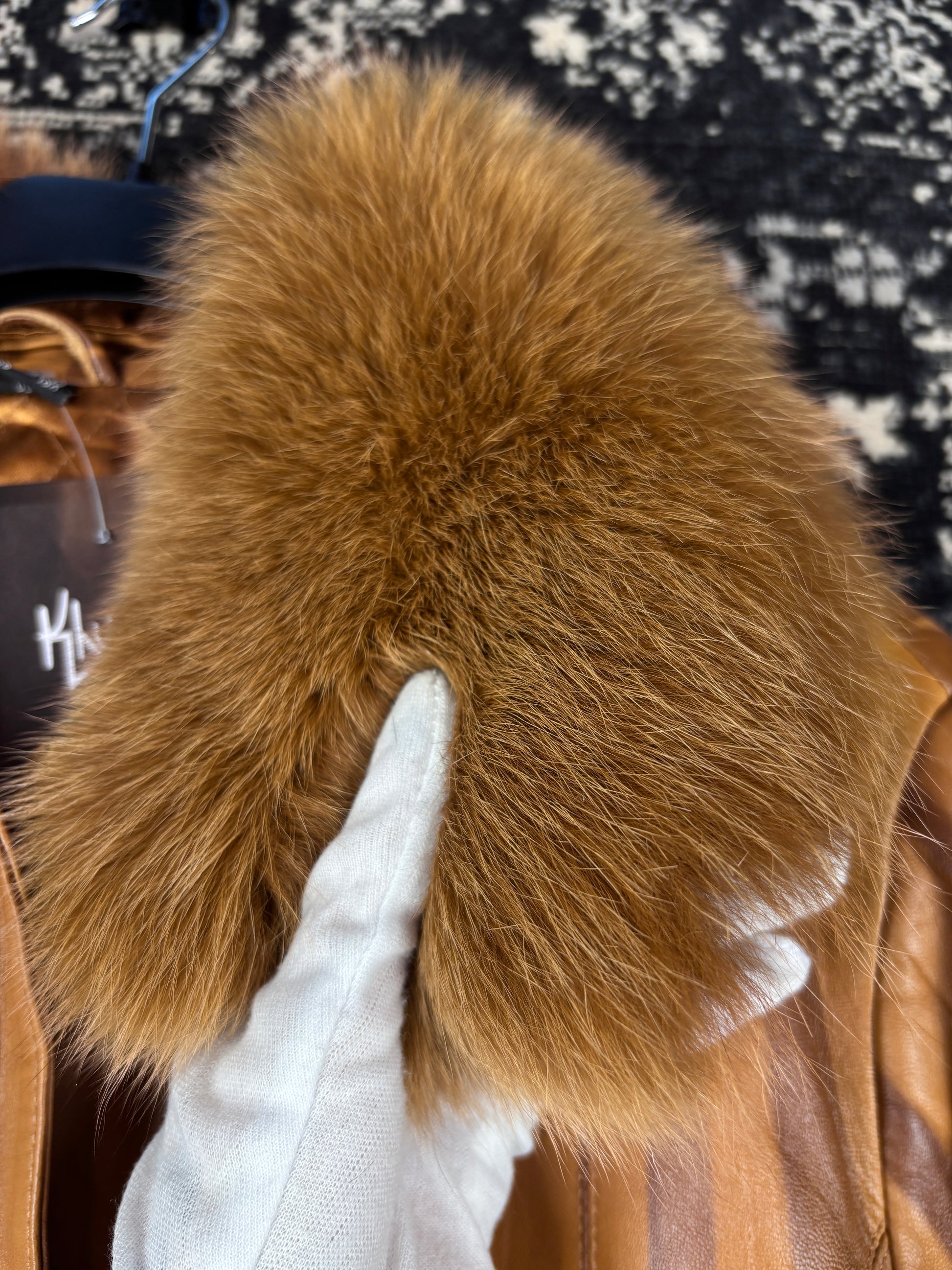 Women's Y2K Caramel Brown Funky Striped Leather Coat with Fluffy Fur Collar Trim - Retro 2000s Statement Outerwear