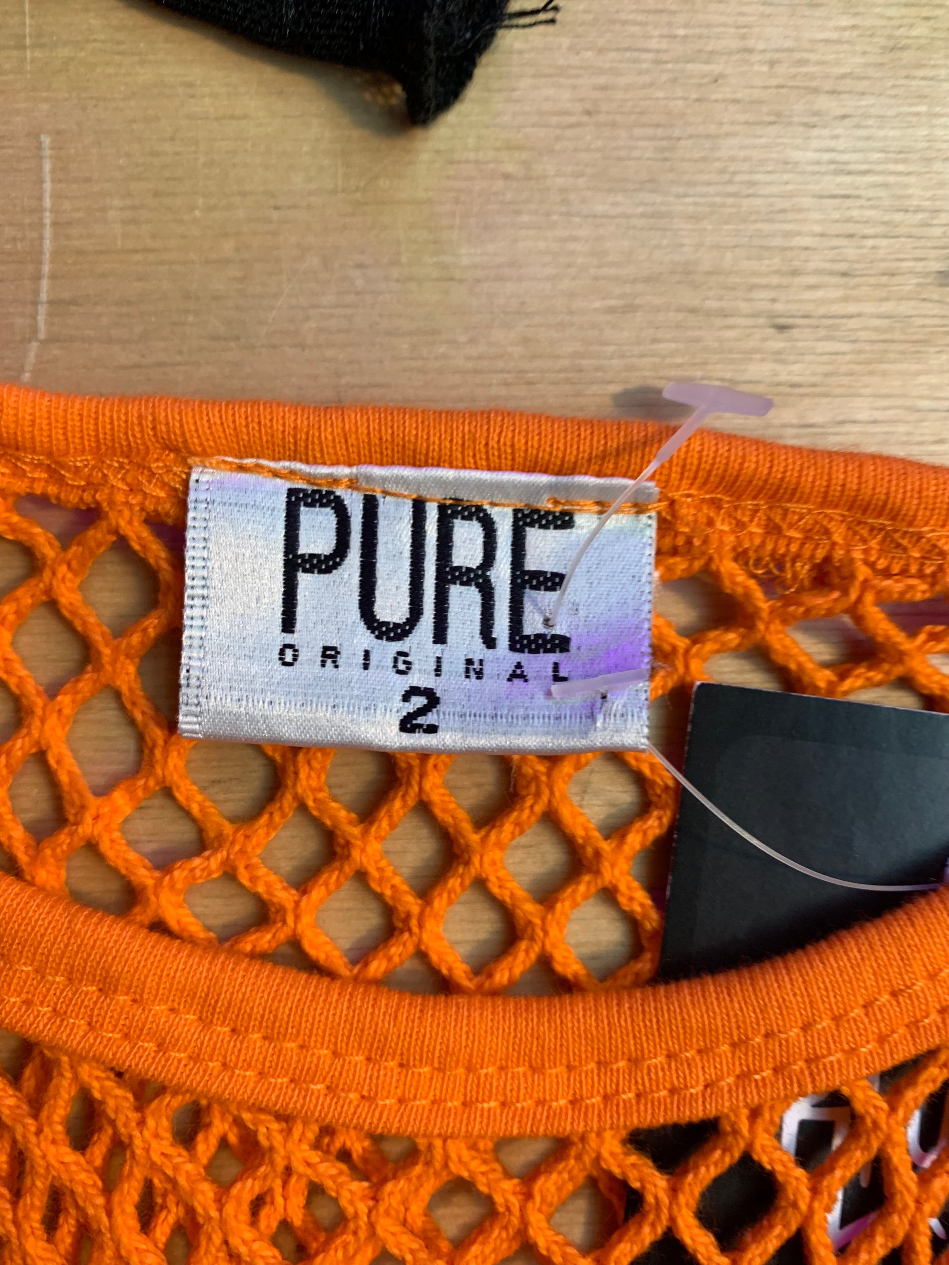 Vintage Y2K Women's Bright Orange Long Sleeve Fishnet Mesh Top by PURE Original, See-Through Net Shirt in Cyberpunk Rave Aesthetic, Retro Festival Layering Tee in Eye-Catching Neon Colorway for 2000s Club Fashion and Streetwear Outfits