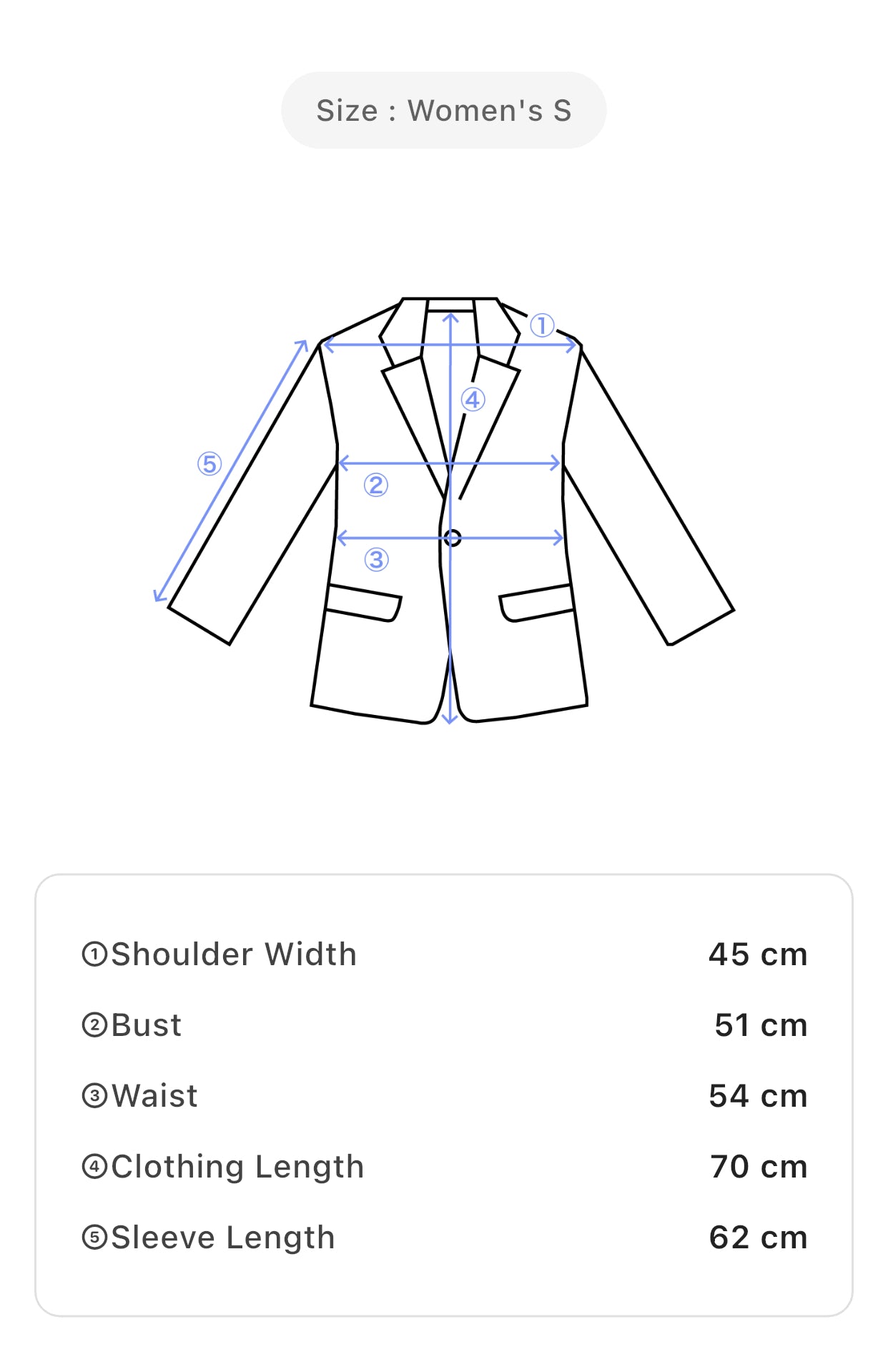 Size: Women’s S, Shoulder Width: 45 cm, Bust: 51 cm, Waist: 54 cm, Clothing Length: 70 cm, Sleeve Length: 62 cm