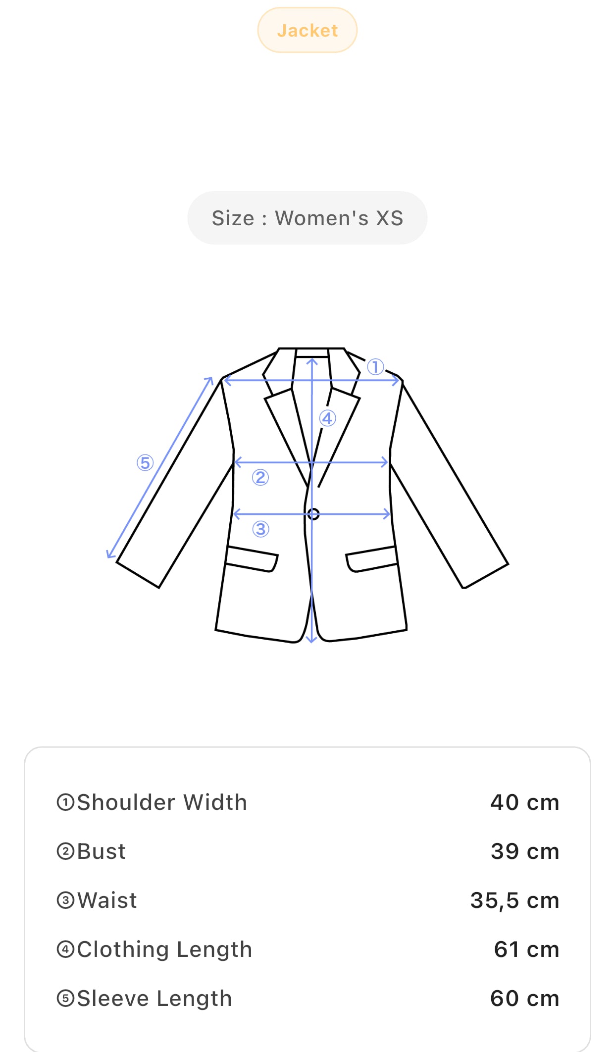 Size: Women's XS: Shoulder 40 cm, Bust 39 cm, Waist 35.5 cm, Length 61 cm, Sleeve 60 cm