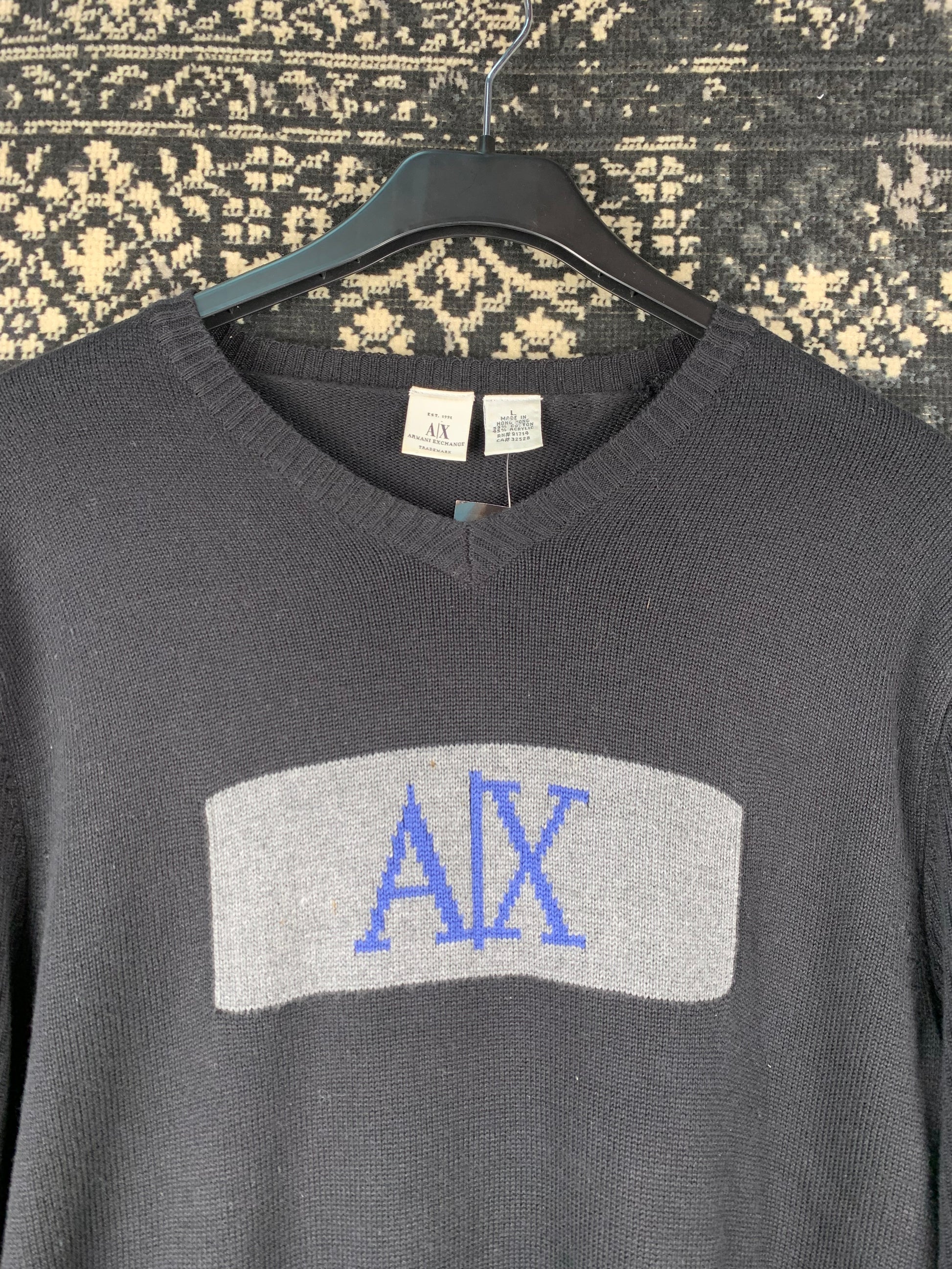 Men’s Armani Exchange Vintage Black Knit Sweater with Blue AX Logo, V-Neck Pullover, Long Sleeve Jumper – Size L, Casual Classic Streetwear