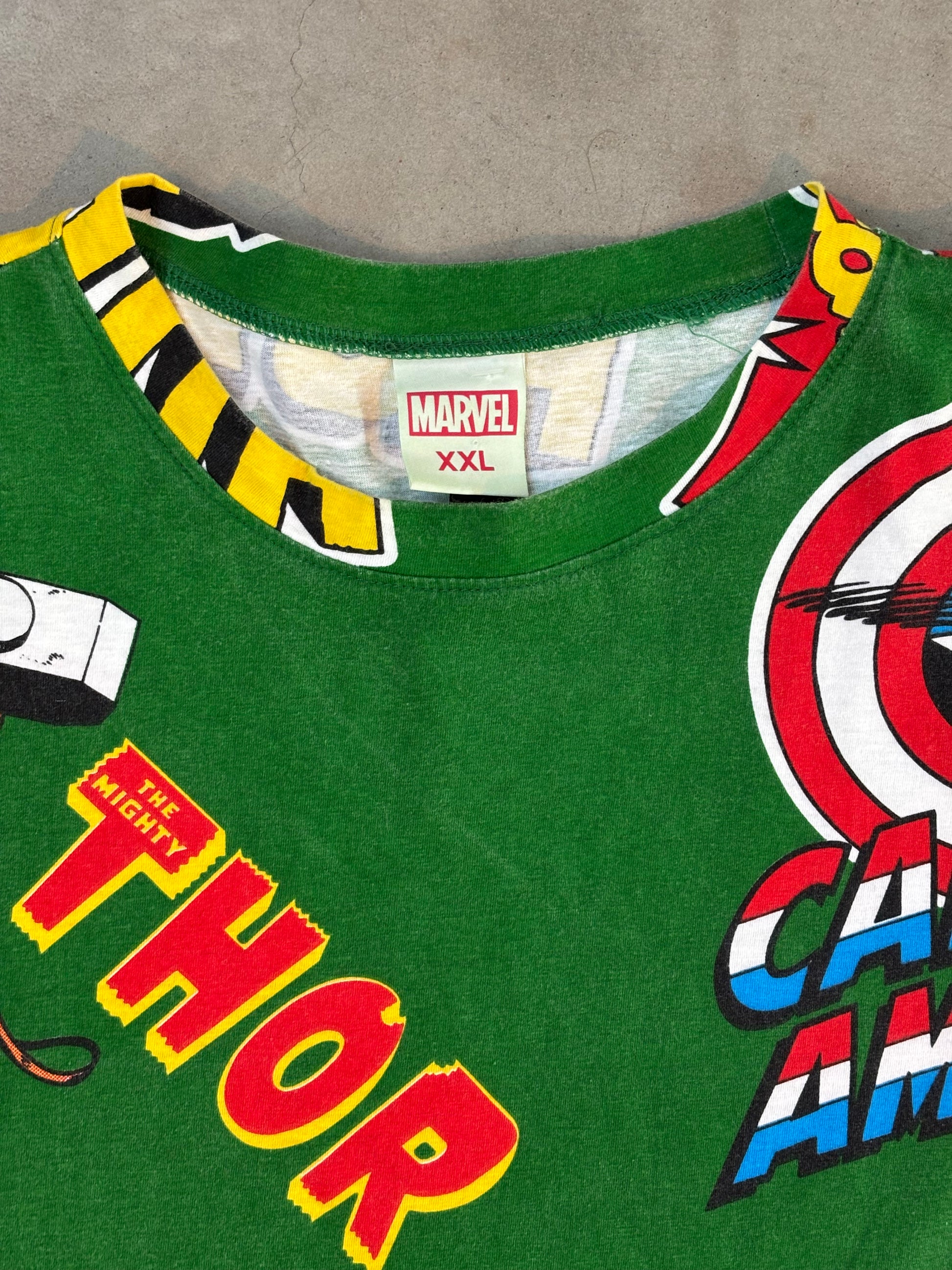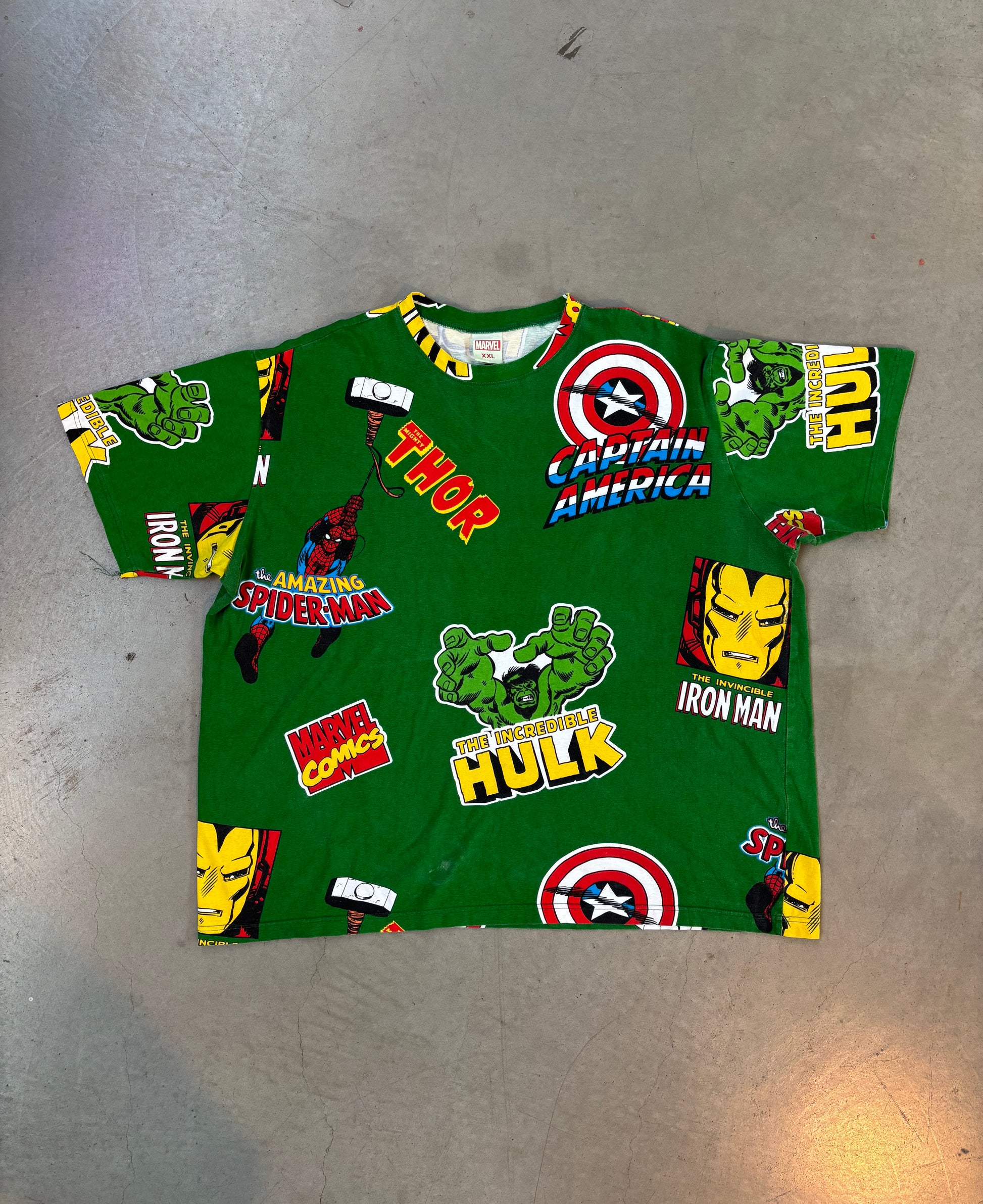 Marvel Heroes Green T-Shirt Men’s XXL Graphic Tee Captain America Iron Man Hulk Thor Spiderman Comic Book Streetwear