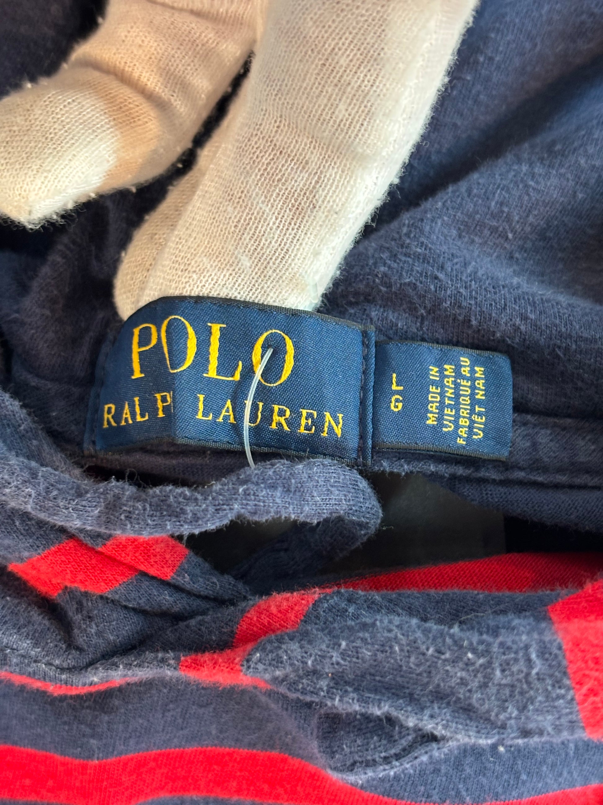 - Design: Classic pullover hoodie with horizontal stripes, adjustable drawstring hood, embroidered Polo Ralph Lauren logo on chest