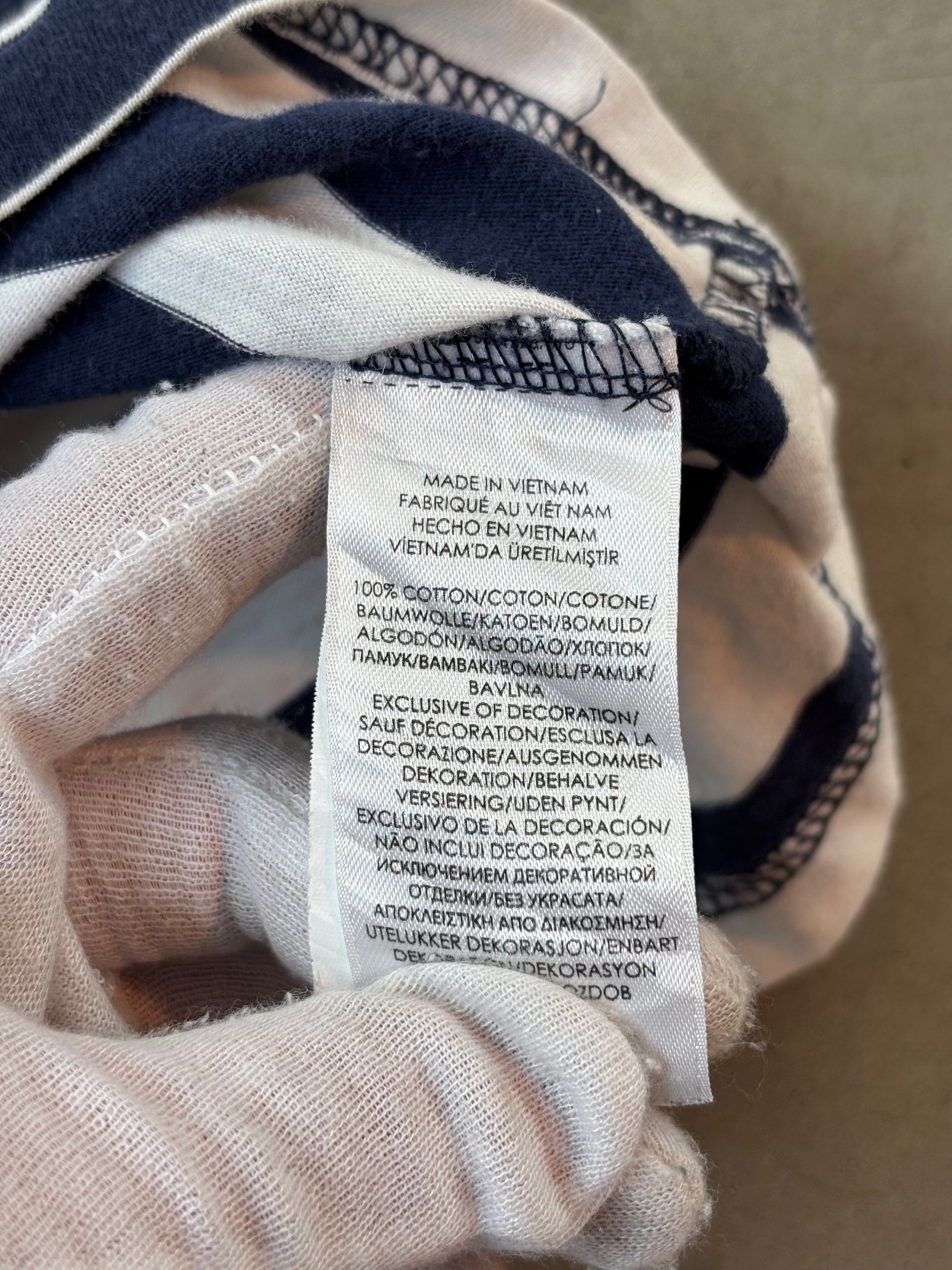 - Color: Multicolor - Navy blue, white, and red striped pattern with green logo embroidery