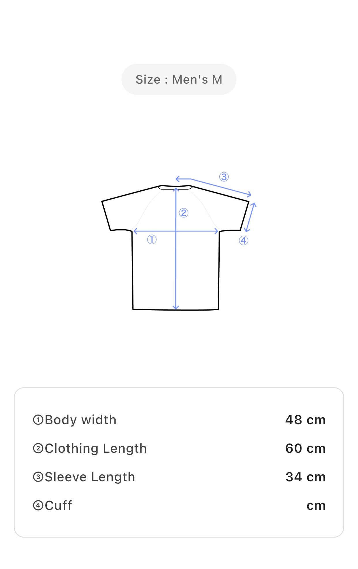 Size: Men’s M, Shoulder Width: 44 cm, Bust: 48 cm, Waist: 48 cm, Clothing Length: 60 cm, Sleeve Length: 34 cm