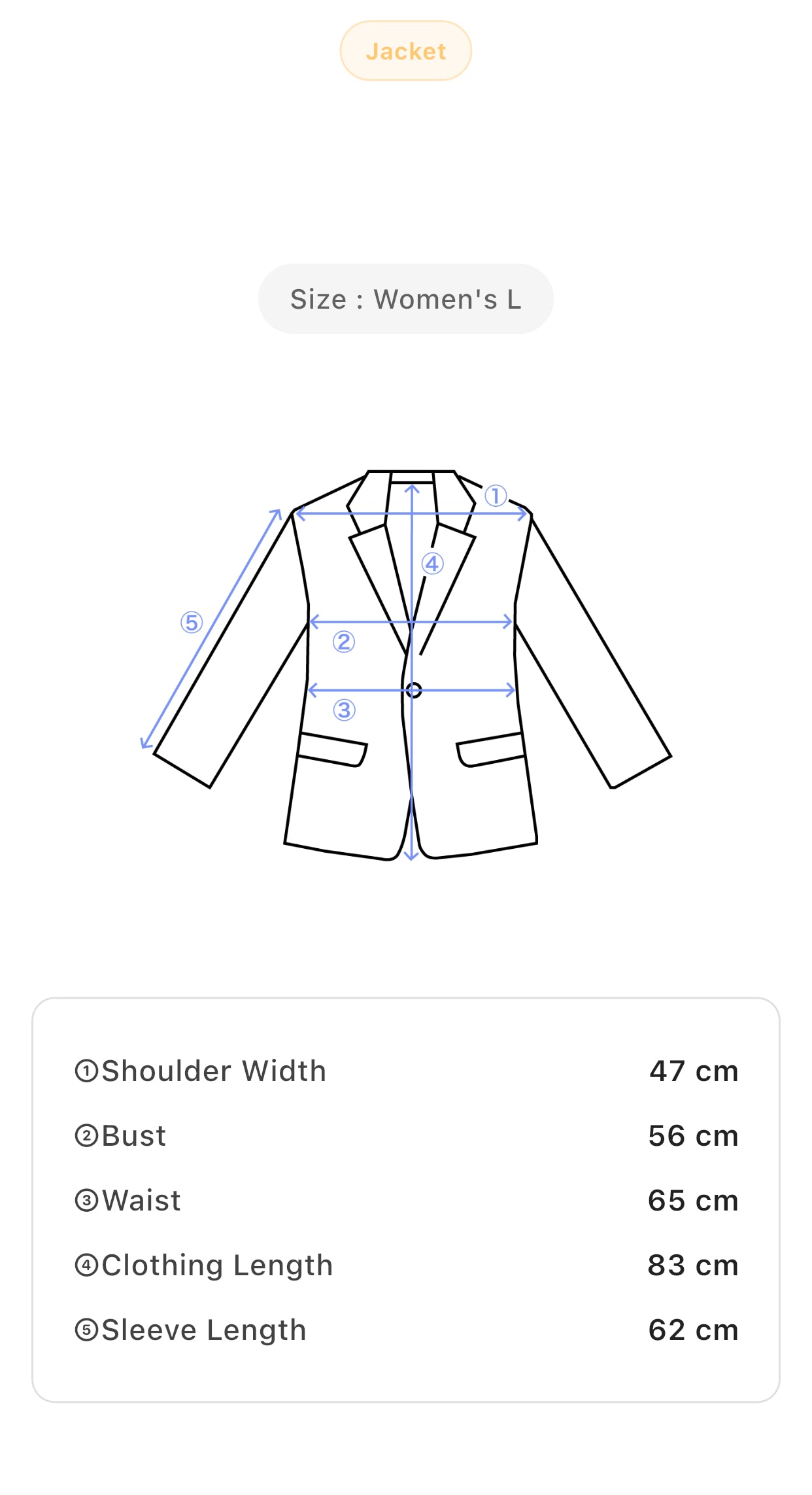 Size: Women’s L (Shoulder Width: 47 cm, Bust: 56 cm, Waist: 65 cm, Clothing Length: 83 cm, Sleeve Length: 62 cm)
