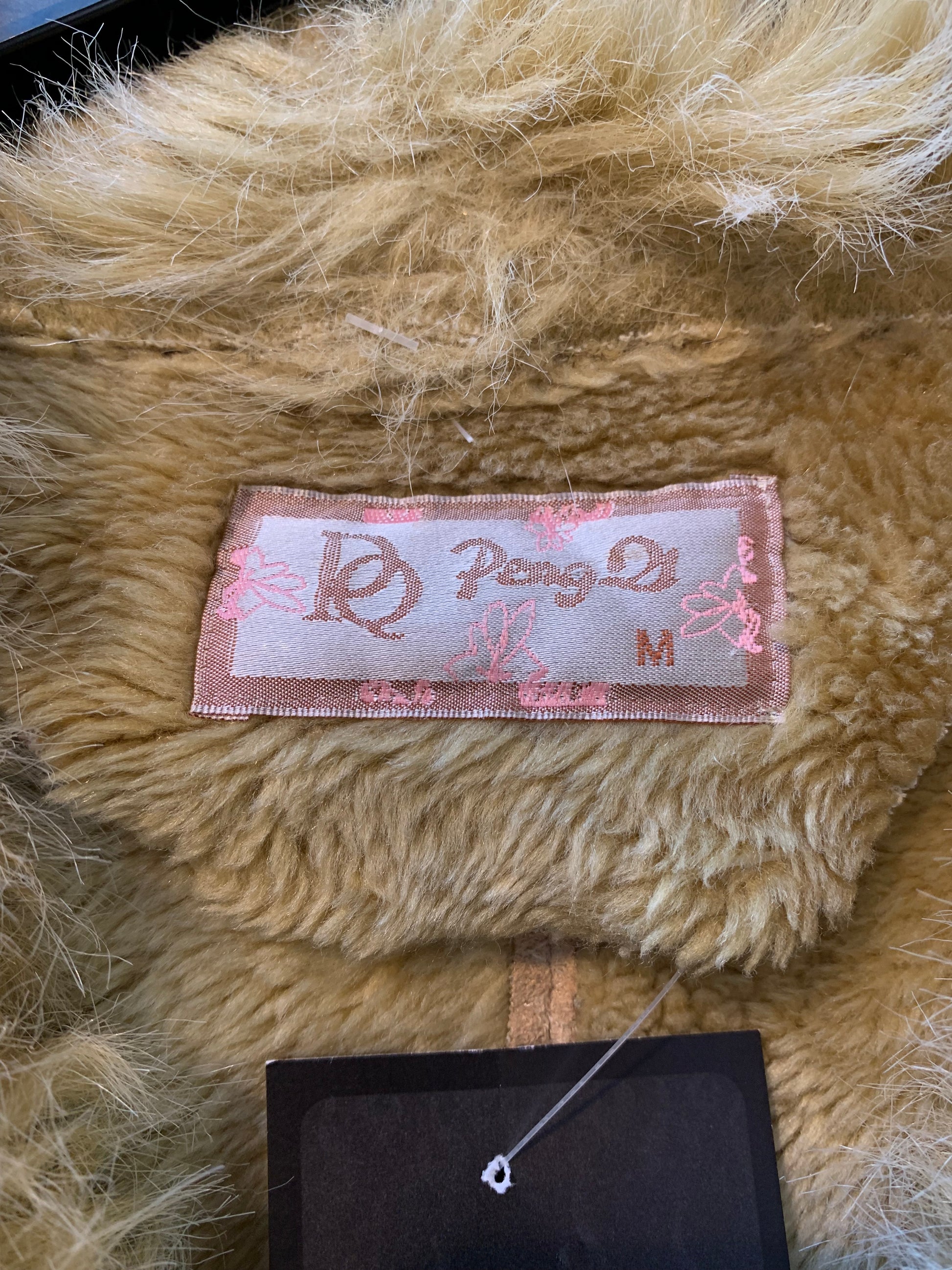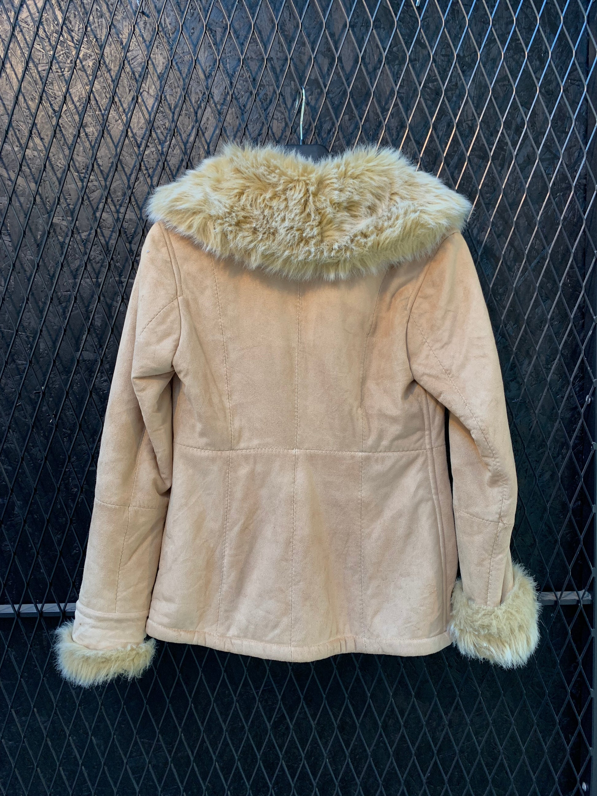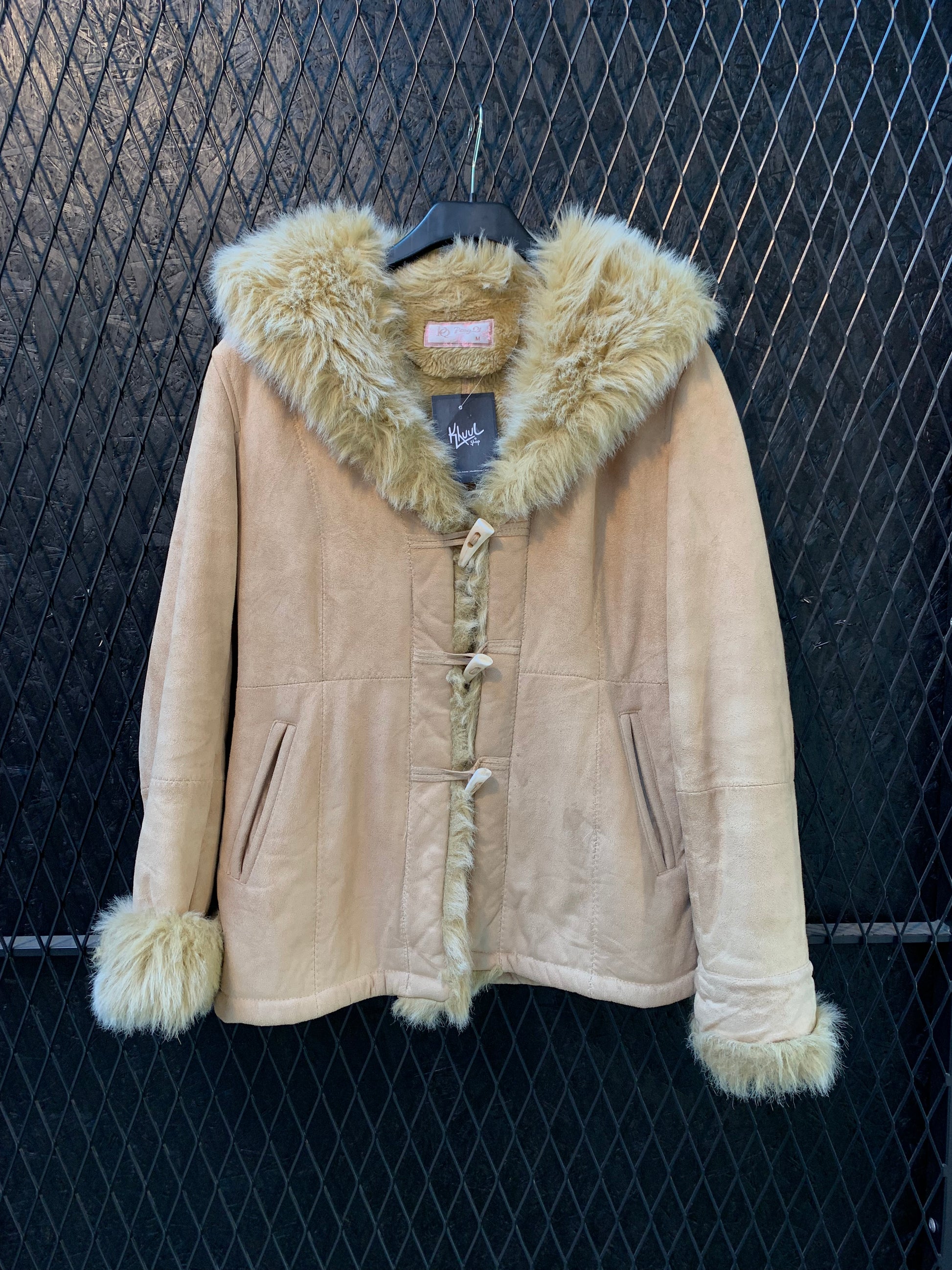Vintage Faux Shearling Beige Coat Women’s M Toggle Front Suede Style Hooded Jacket with Fuzzy Trim Cuffs Cozy Winter Outerwear