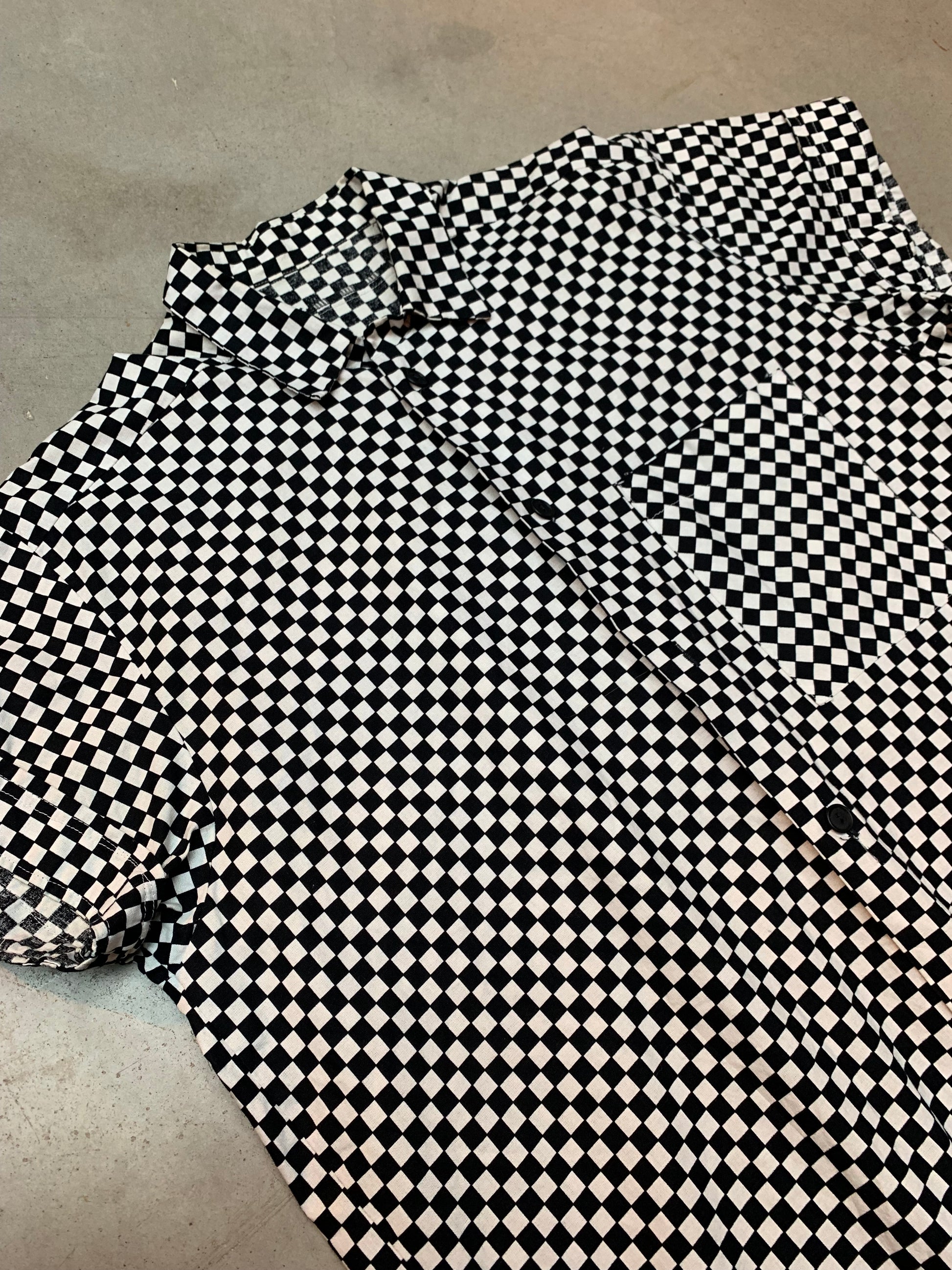 Y2K Unisex Oversized Checkered Button Up Shirt – Black White Short Sleeve Collared Top with Front Pocket, Retro 2000s Streetwear Style