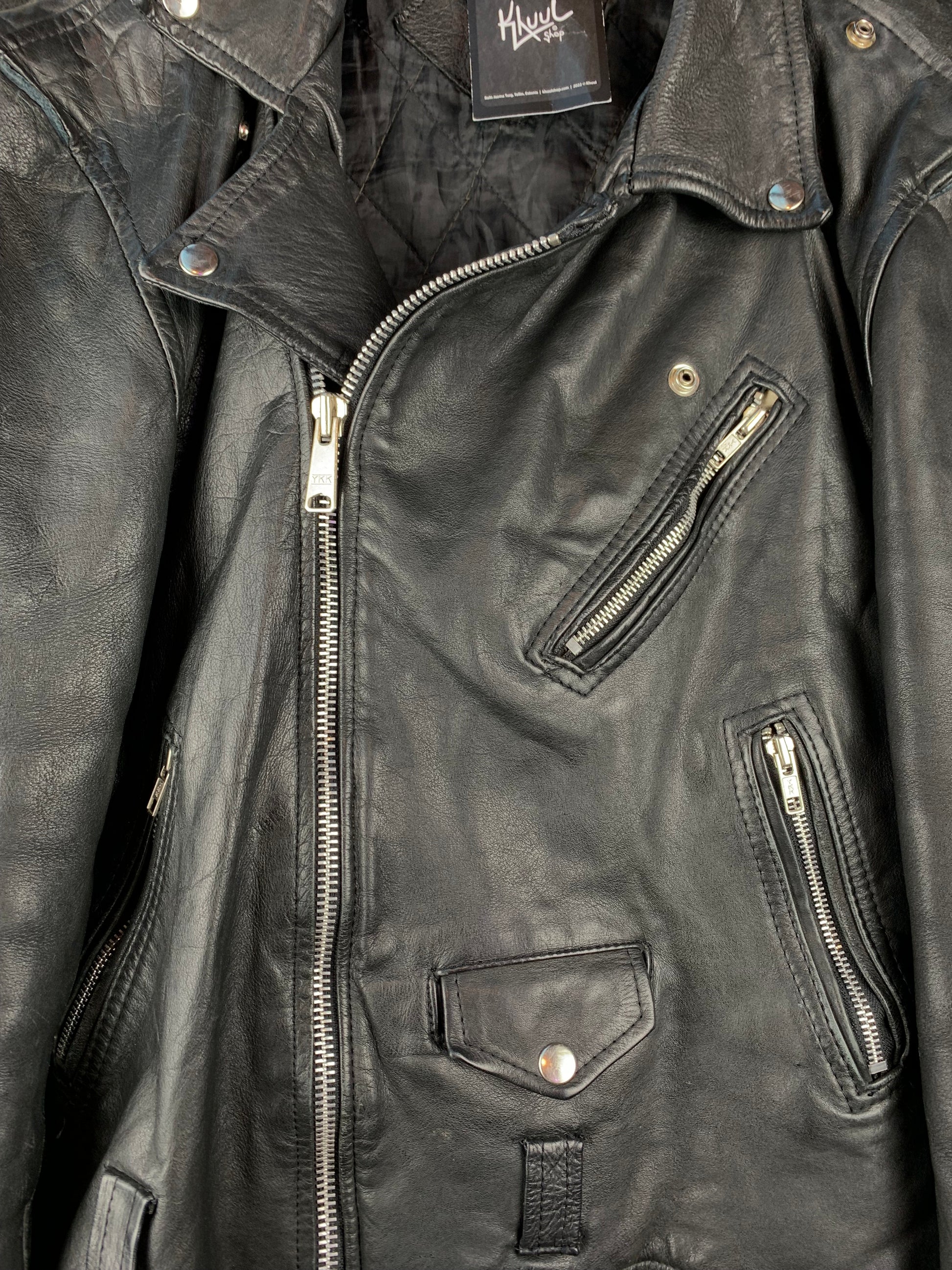 Men's Vintage Black Biker Leather Jacket with Multiple Zip Pockets and Quilted Inner Lining – Asymmetrical Front – Men's XL