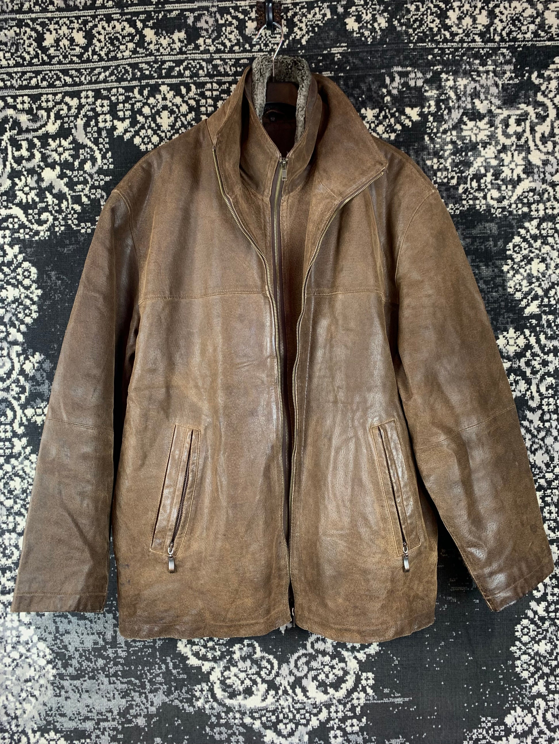 Color: Dark brown leather with a distressed finish and inner shearling-style lining