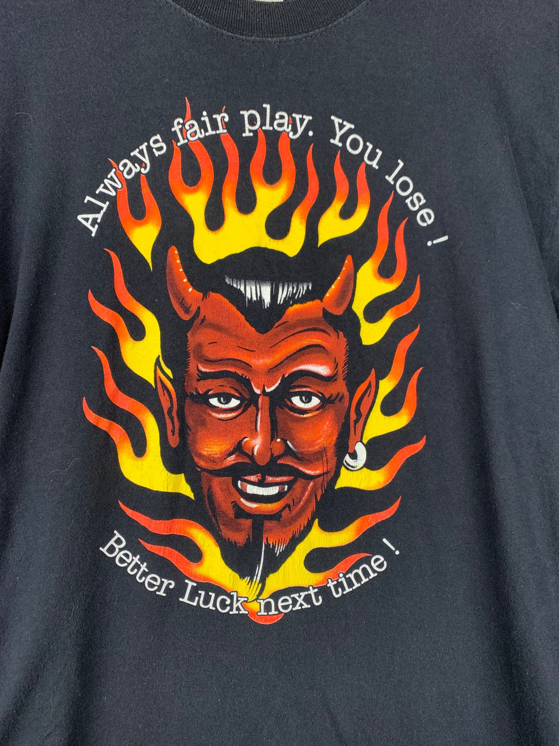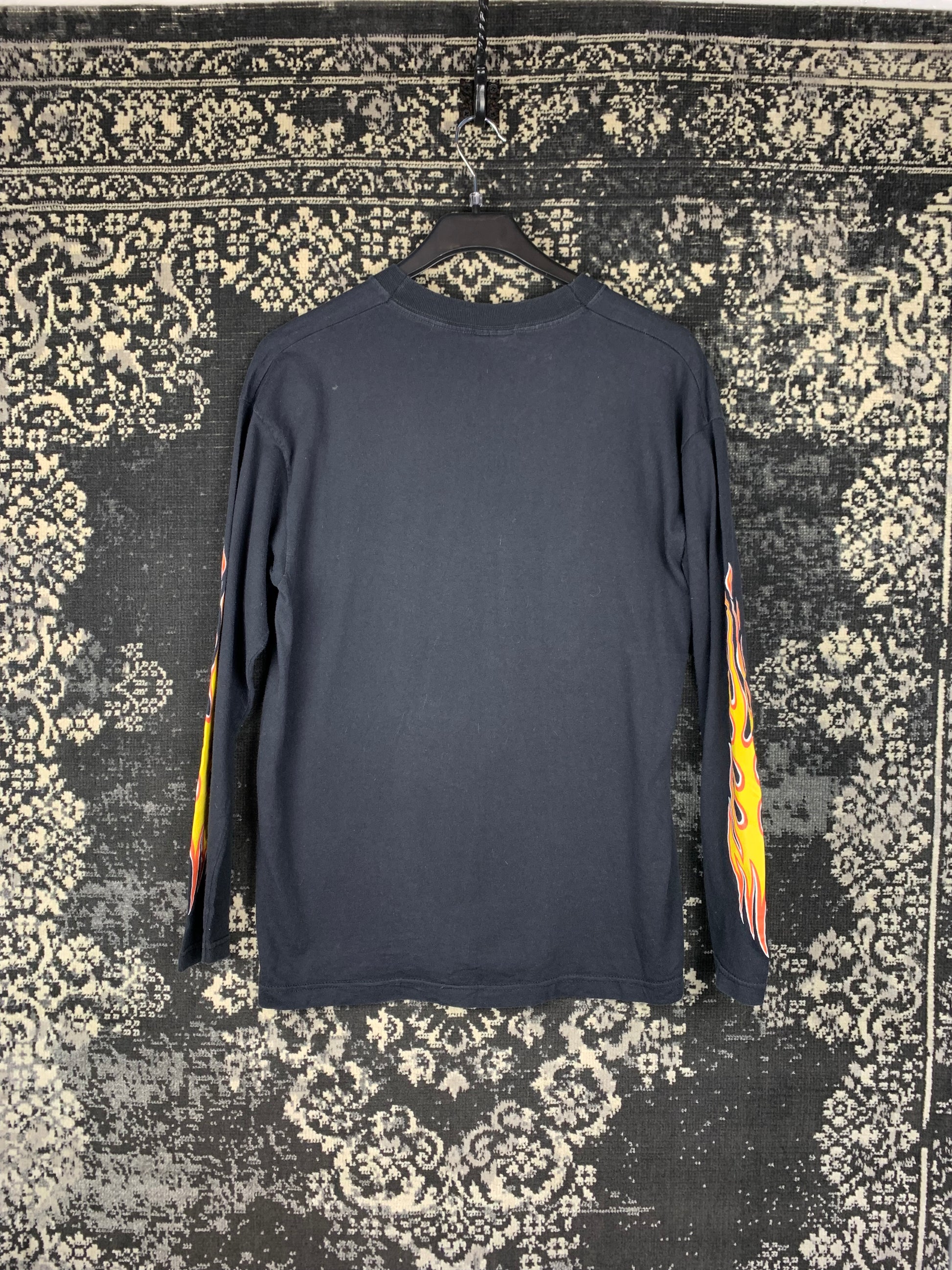 Men's Vintage Devil Print Graphic Black Longsleeve Shirt with Flame Sleeve Design