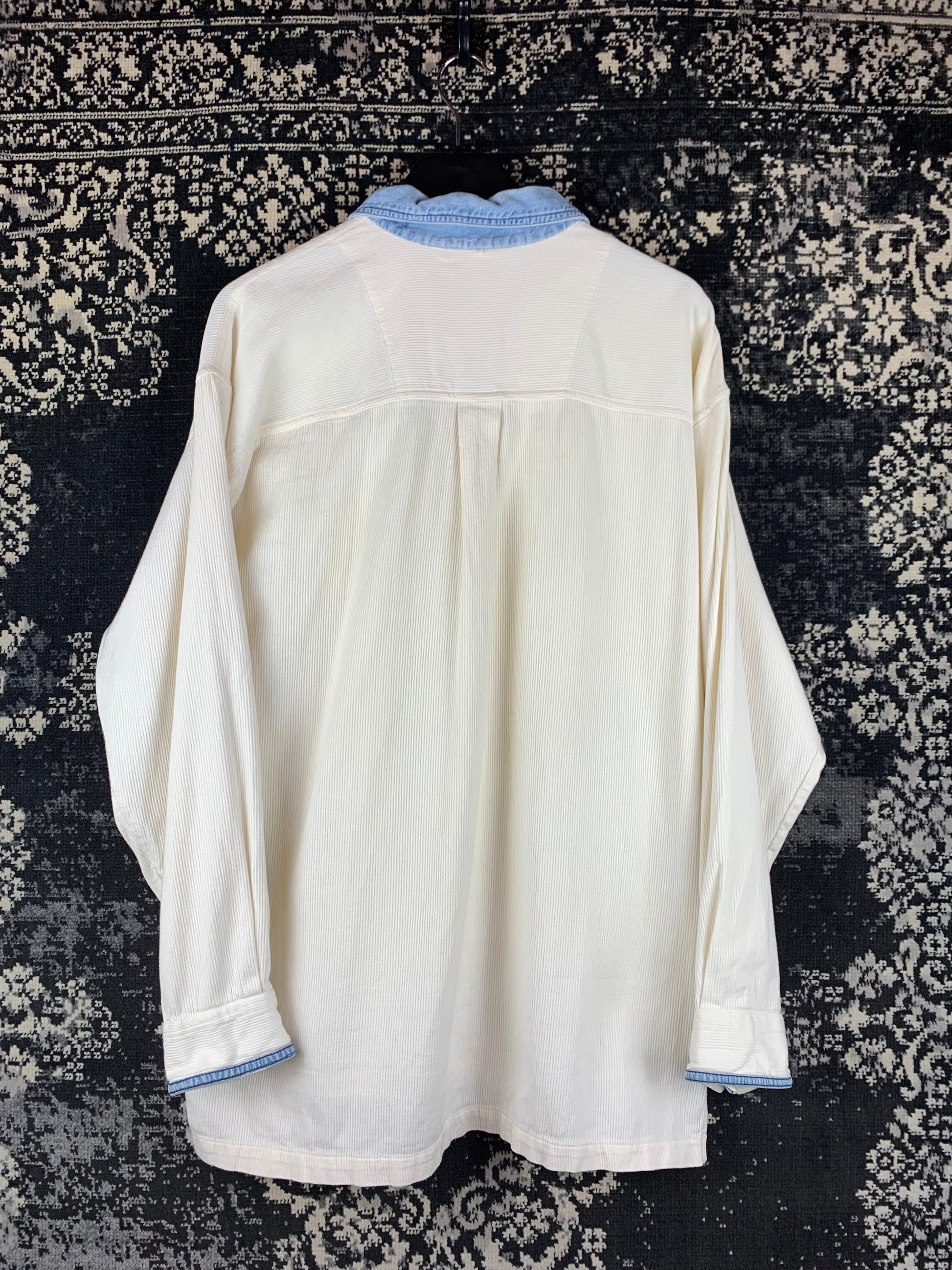 Men's Vintage Cream Polo Sweatshirt with Denim Trim Collar, Chest Pocket and Quarter Zip Y2K Casual Streetwear Look