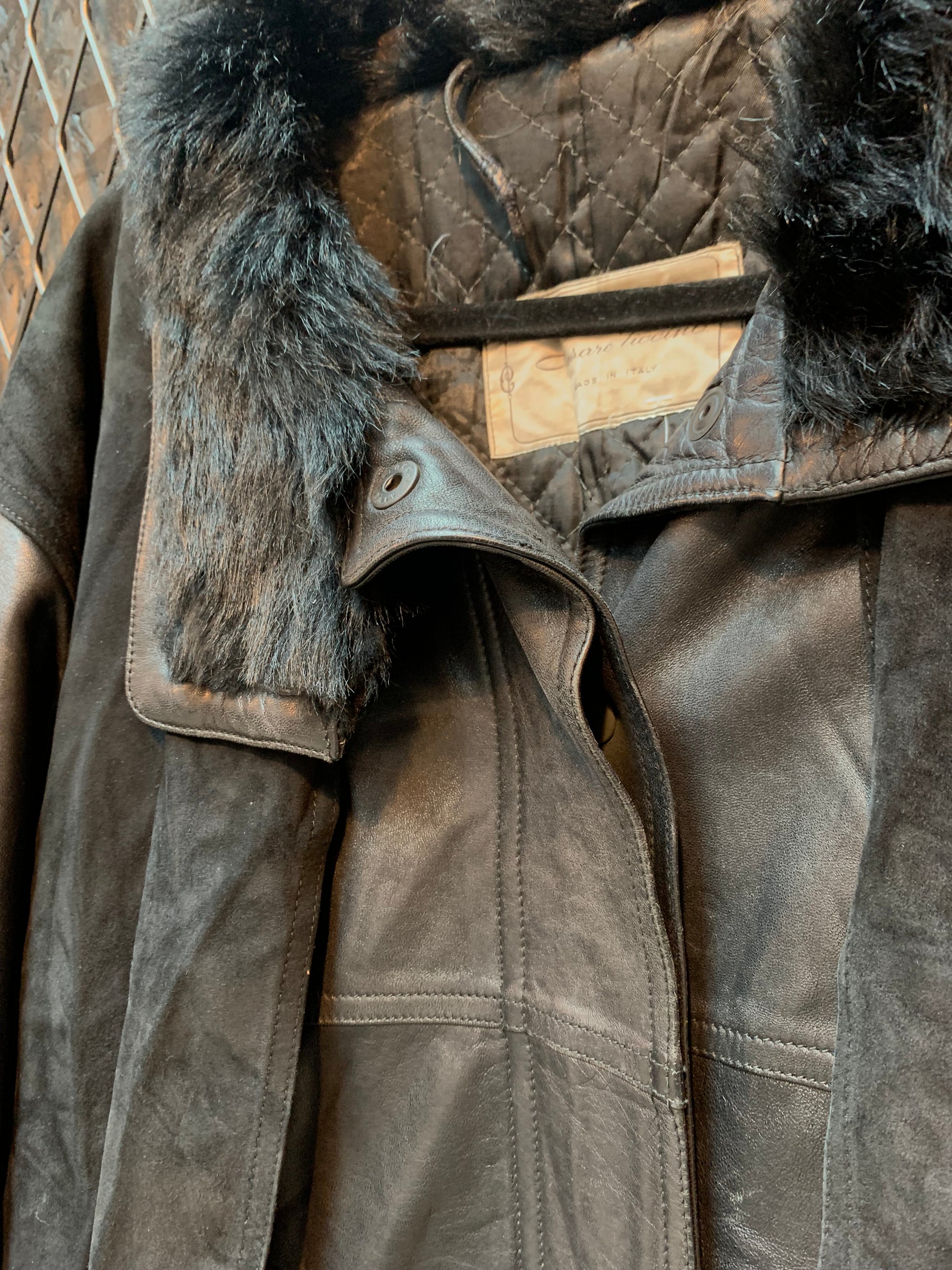 Women's Vintage Cesare Piccini Black Leather Trench Coat with Faux Fur Collar and Suede Panel Detailing – Italian Made Long Winter Outerwear – Size XL