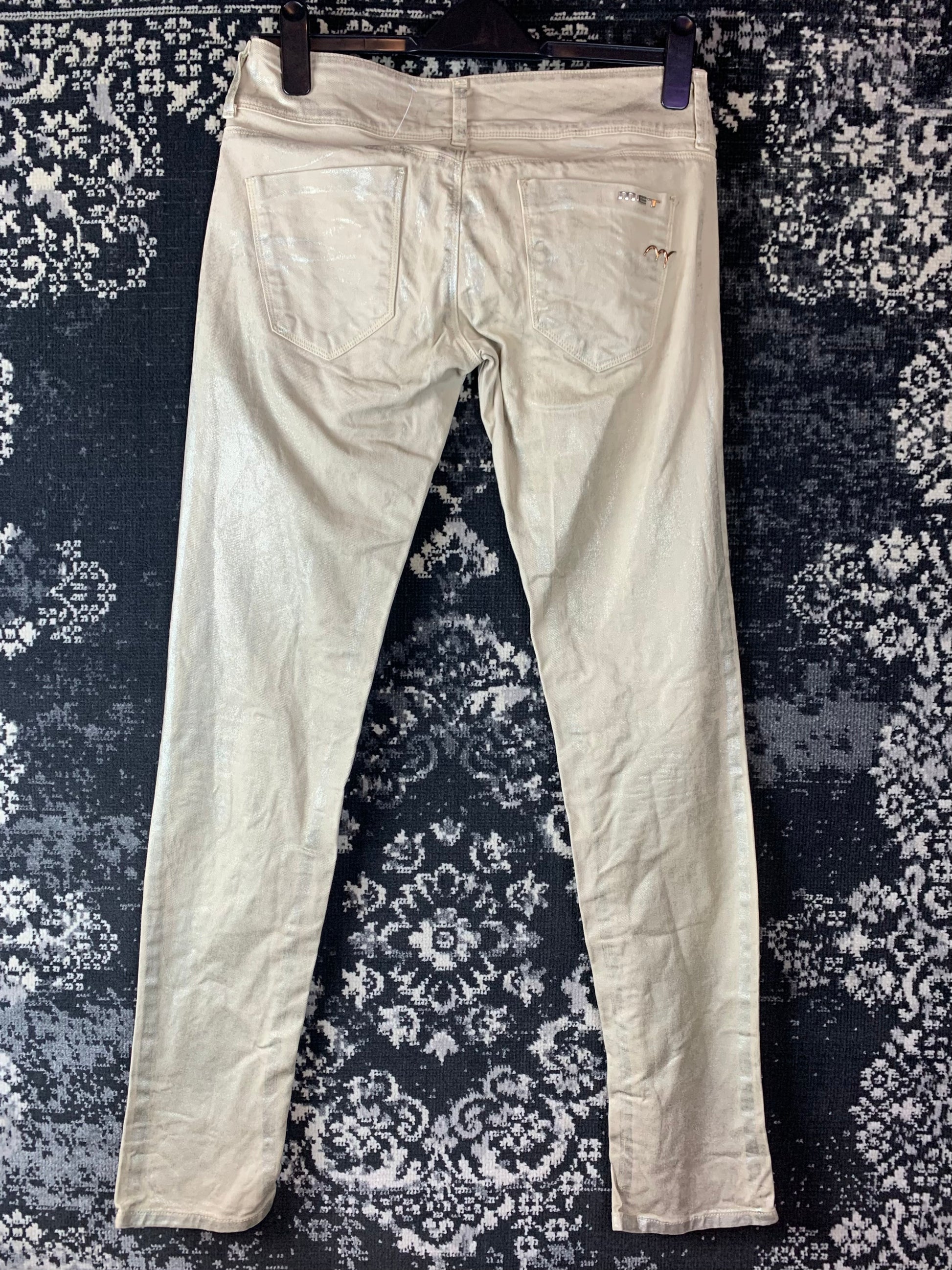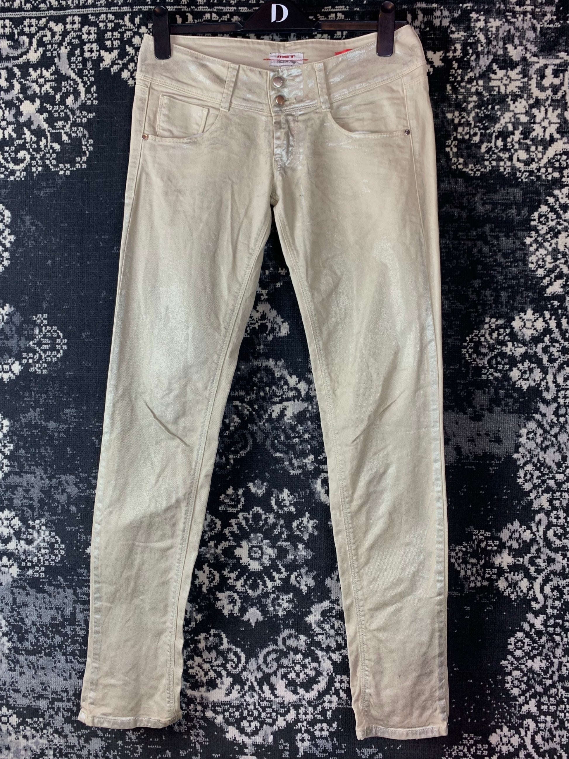 Y2K Women's Angel Style Skinny Fit Cream Shimmery Jeans – Retro Metallic Look High Waist Pants