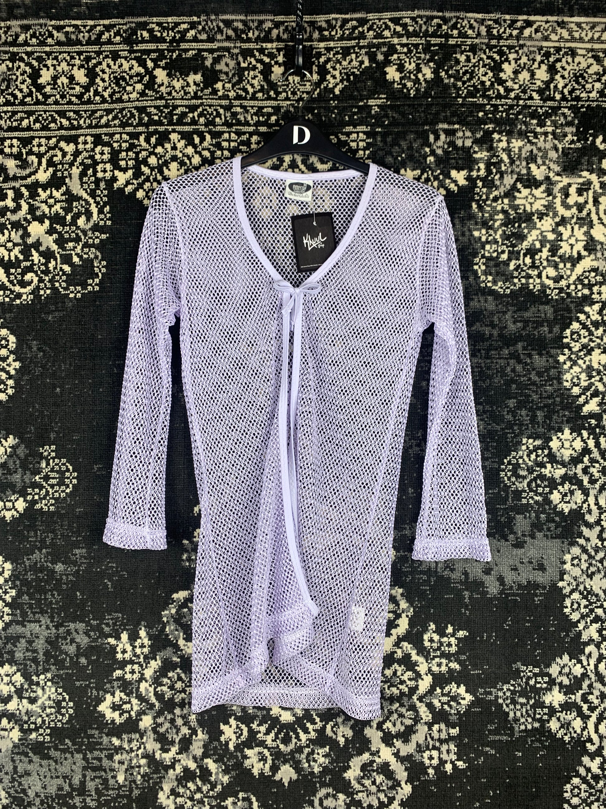 Y2K Women's Pastel Purple Sheer Mesh Knit Long Sleeve Top with Tie Front Detail – Vintage See-Through Layering Shirt