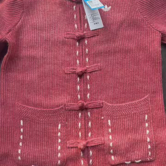 Made from soft velour/fleece with classic Trefoil logo, three-stripe sleeves, and frog-button detailing.