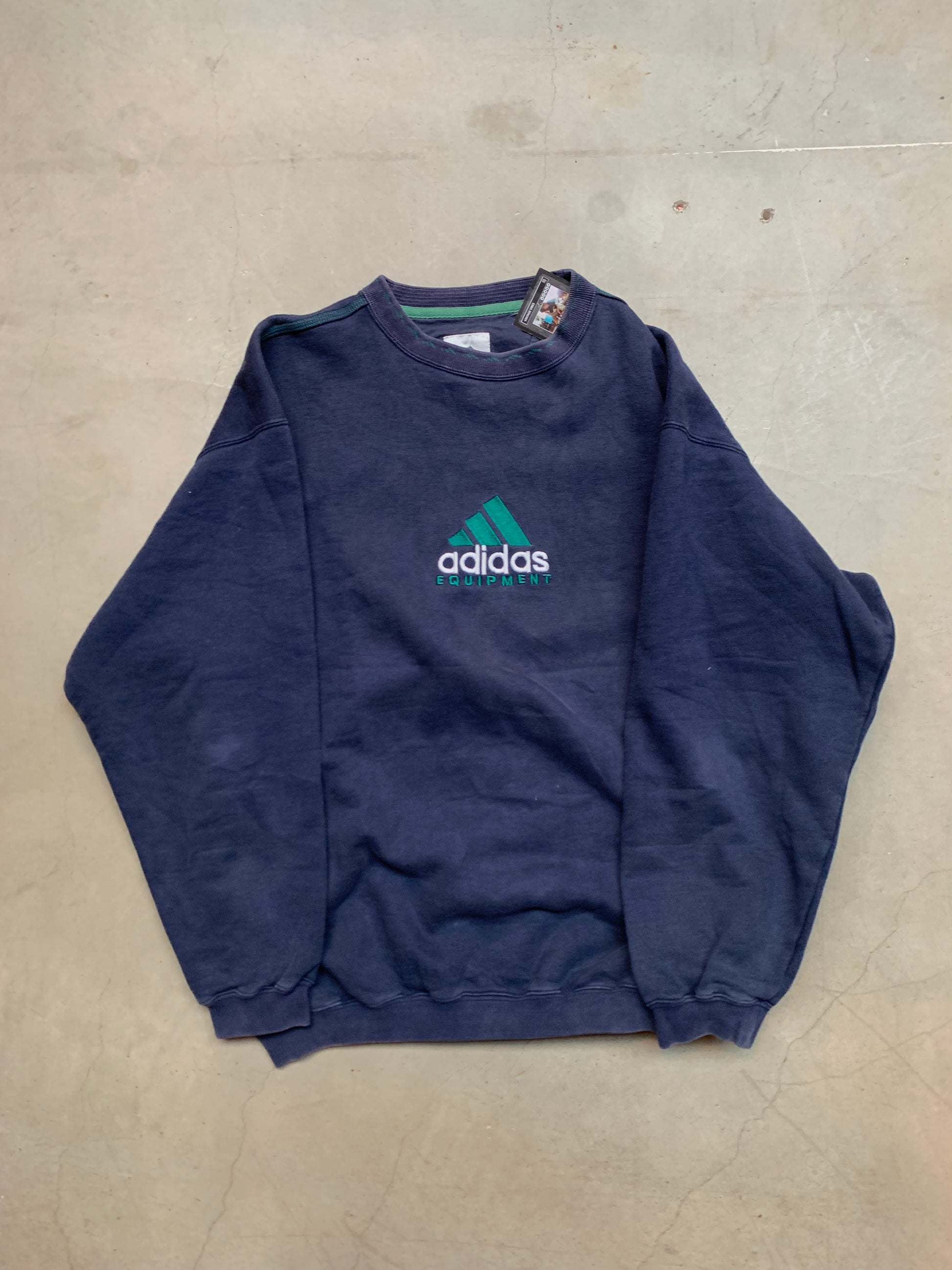 Y2K Adidas Equipment Navy Blue Sweatshirt – Classic Trefoil Logo Crewneck Pullover, Vintage Streetwear Men's L Size with Bold 90s Vibe