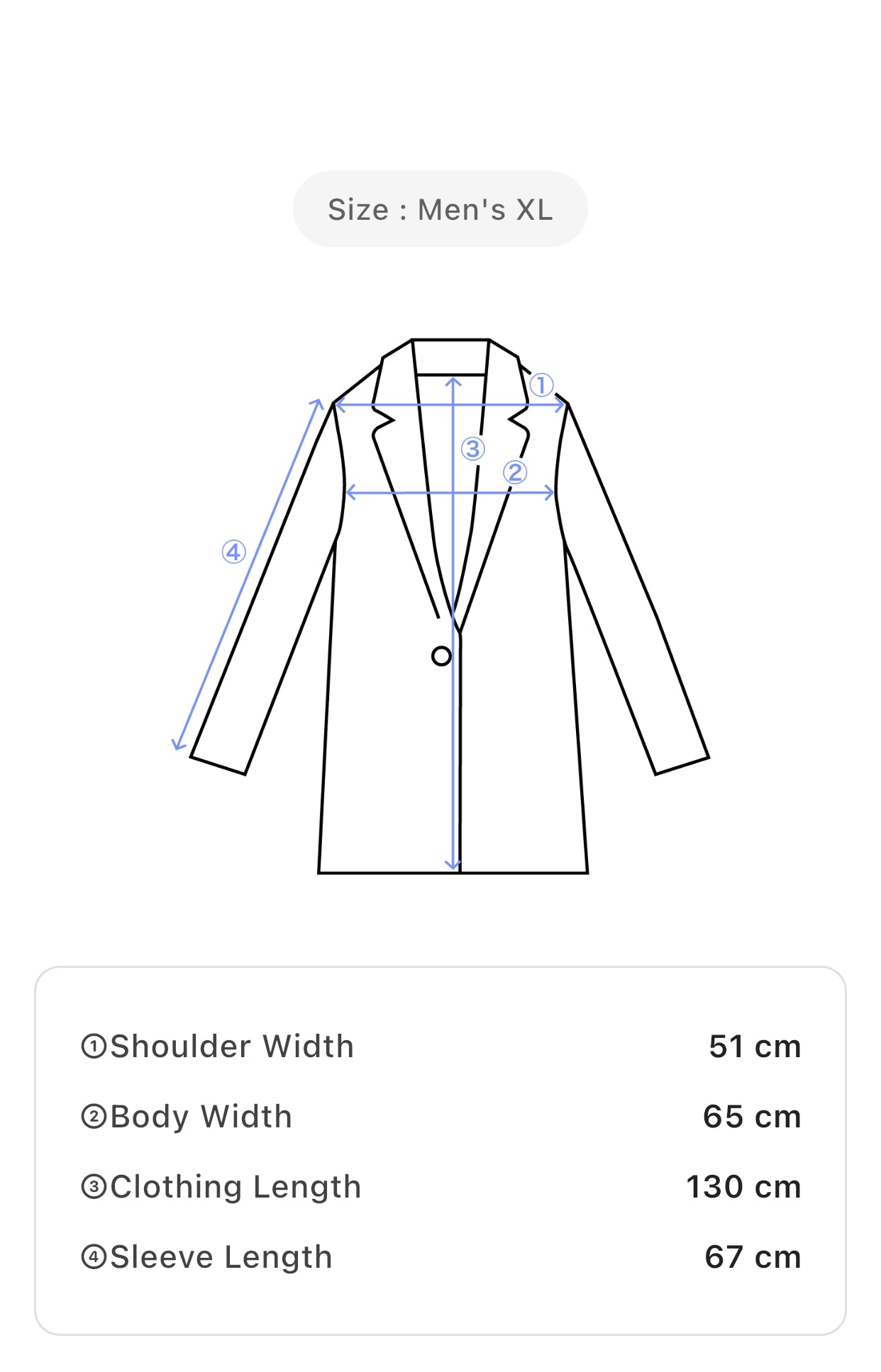 Size: Men's XL — Shoulder Width: 51 cm, Body Width: 65 cm, Clothing Length: 130 cm, Sleeve Length: 67 cm