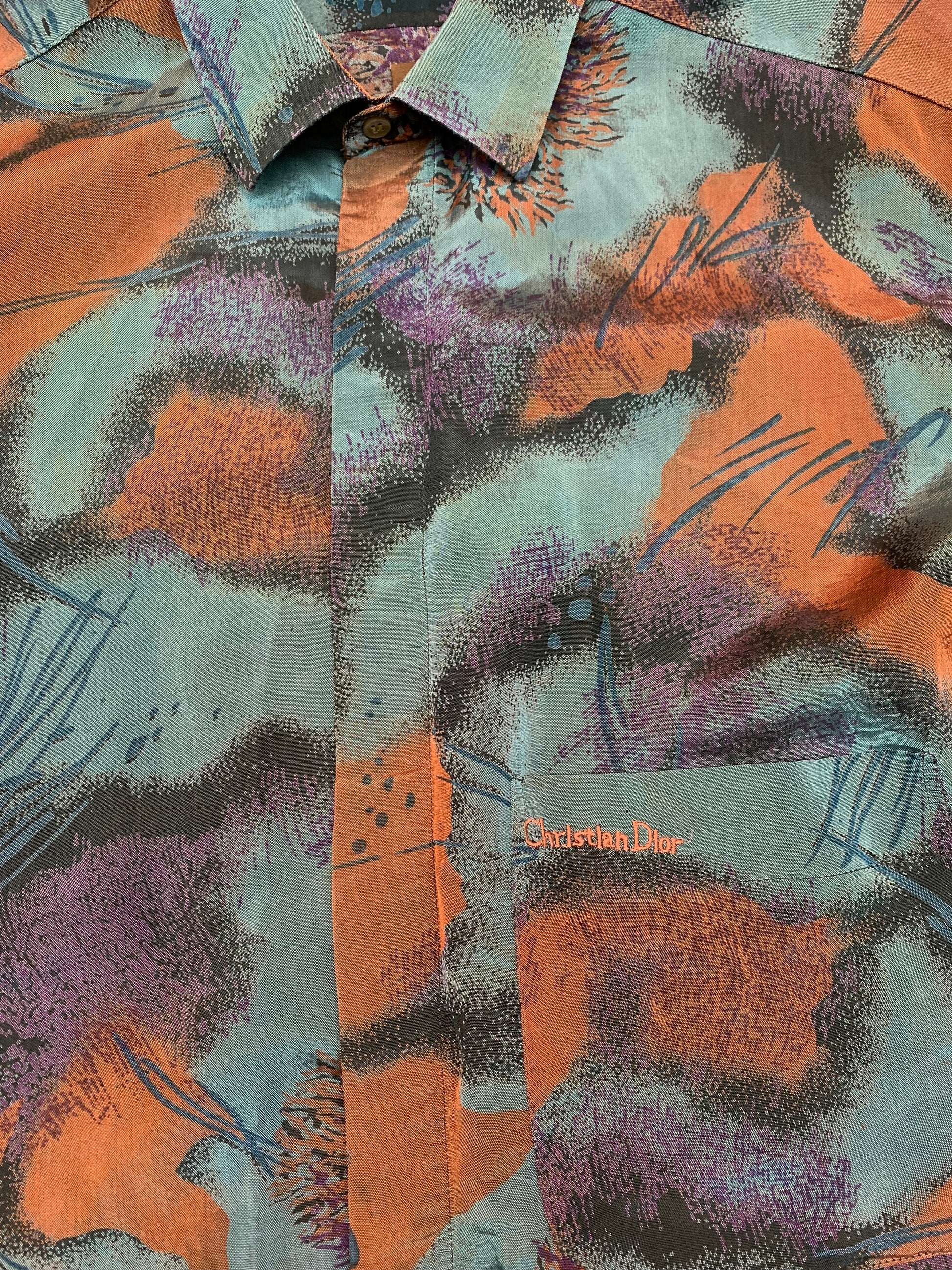 Christian Dior Vintage Silk Shirt Abstract Floral Print Blue Orange Purple Pattern Button Up Short Sleeve Luxury Men's Size L