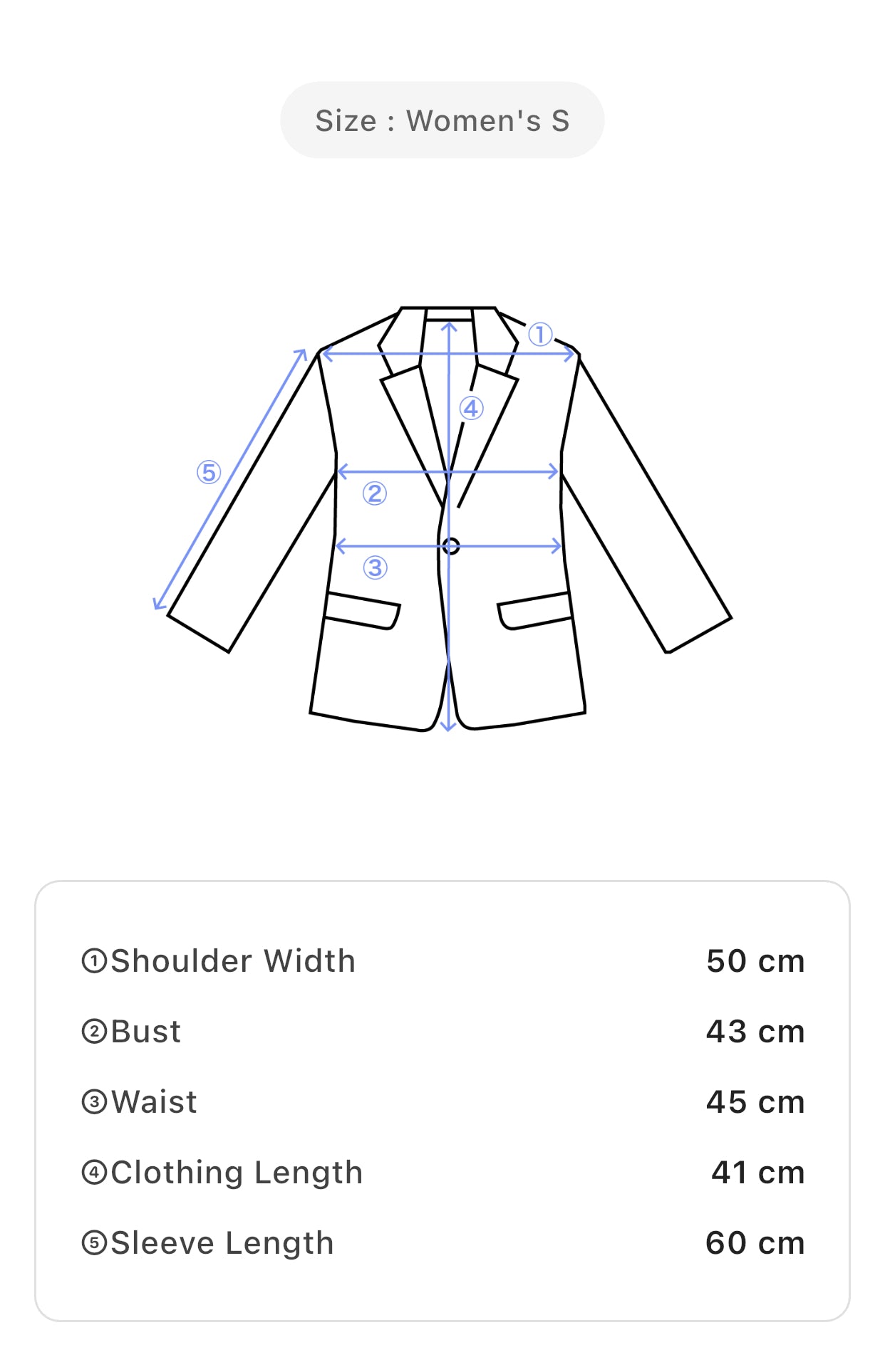• Size: Women's S — Shoulder Width: 50 cm, Bust: 43 cm, Waist: 45 cm, Clothing Length: 41 cm, Sleeve Length: 60 cm