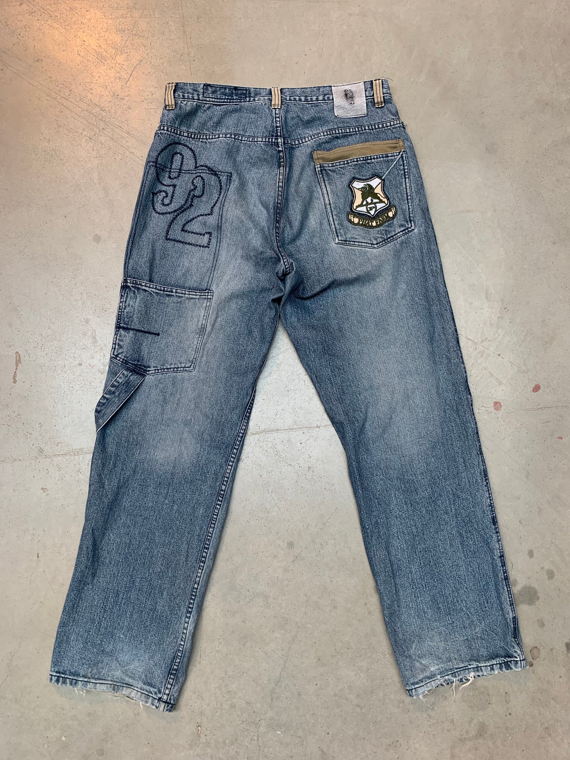Vintage Men's Phat Farm Baggy Jeans - Y2K Streetwear Denim with Embroidered Patches, Multi Pocket Utility Style, Contrast Stitch Work and Side Cargo Panel