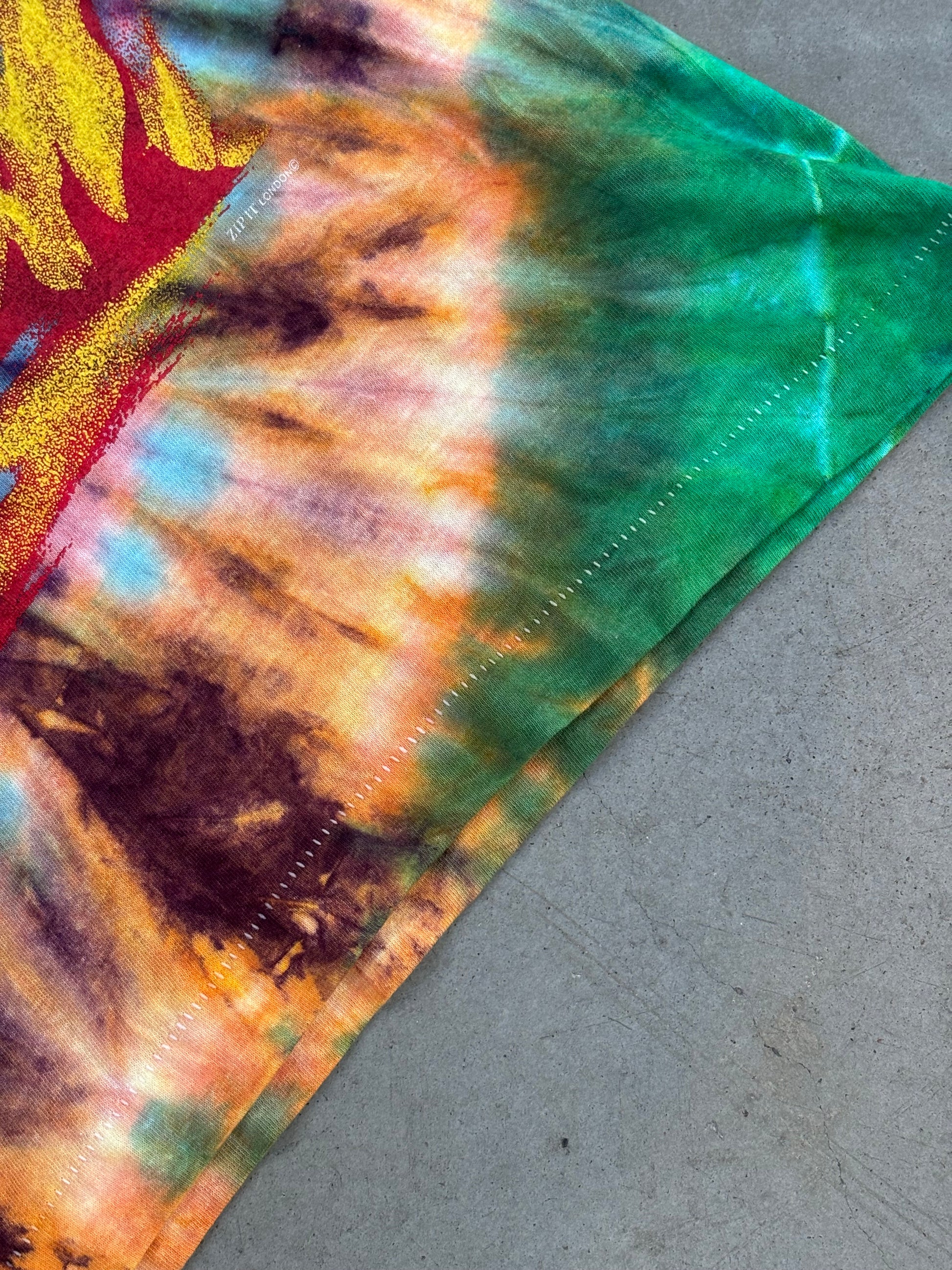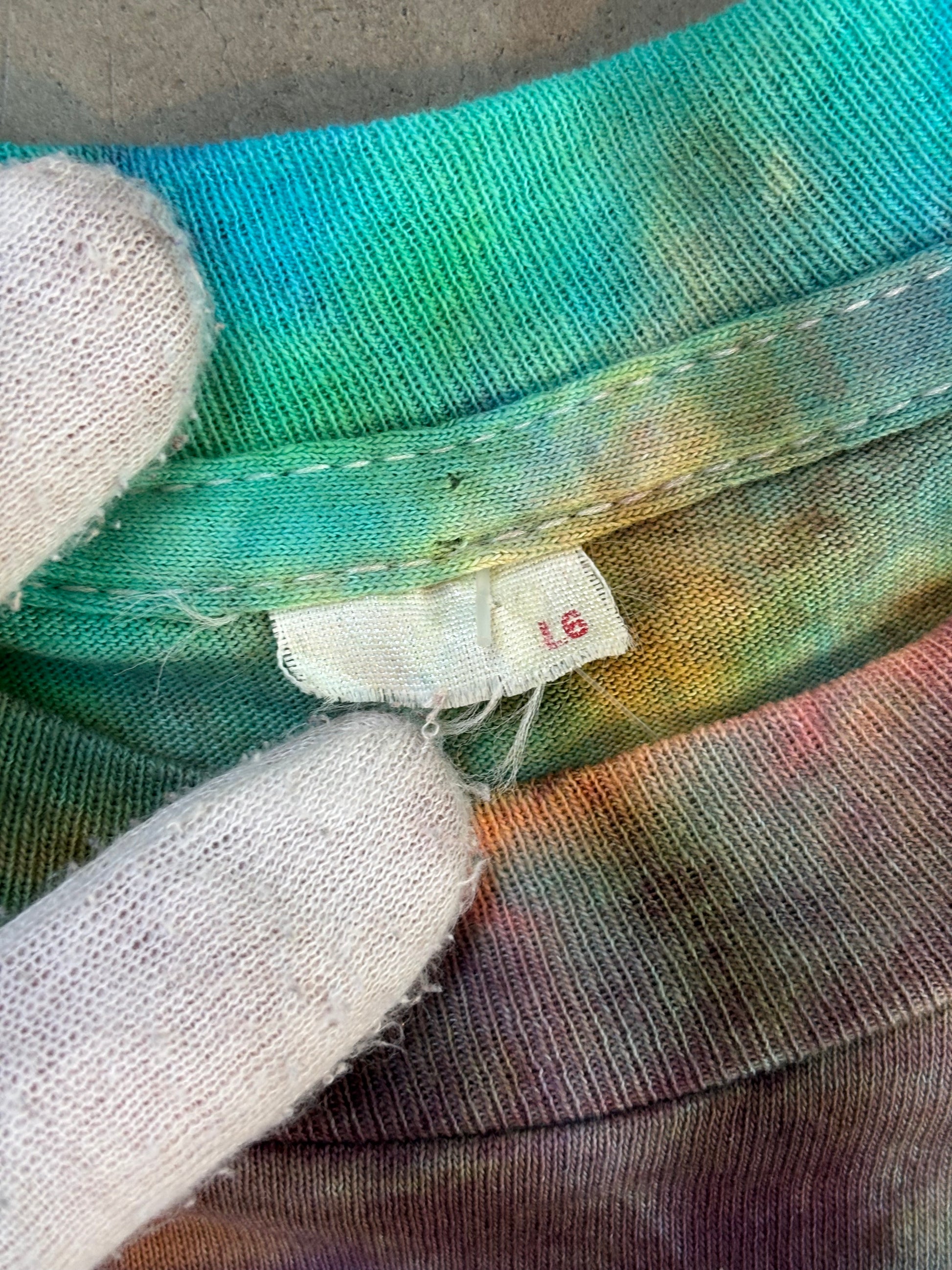 This vintage single stitch tie dye t-shirt in vibrant multicolor with a bold biker skeleton graphic is a true streetwear gem 🌈🔥. Perfect for collectors and fans of retro style.