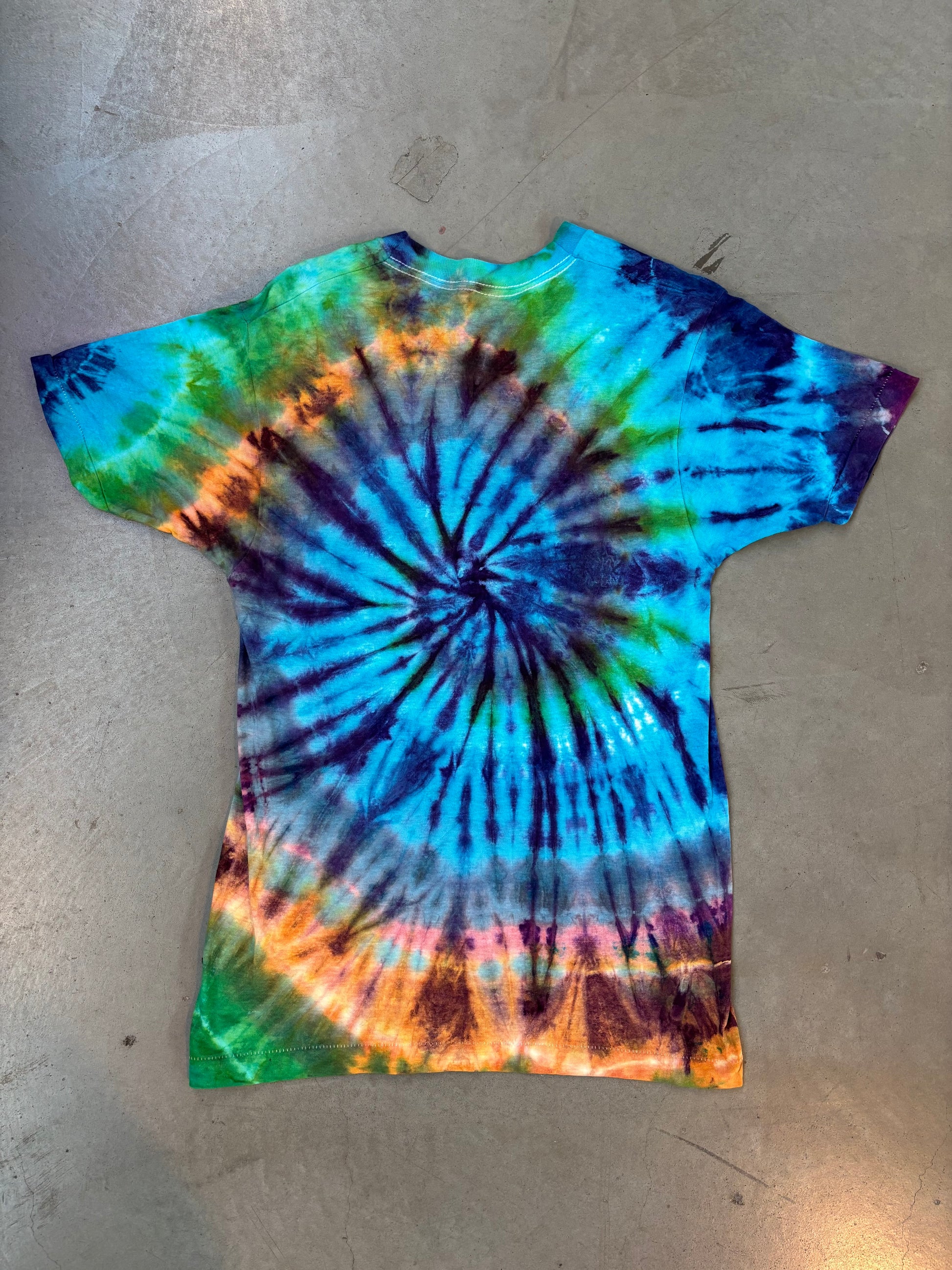 Features: Single stitch hem, tie dye design, skeleton motorcycle print, short sleeves, crewneck, relaxed fit