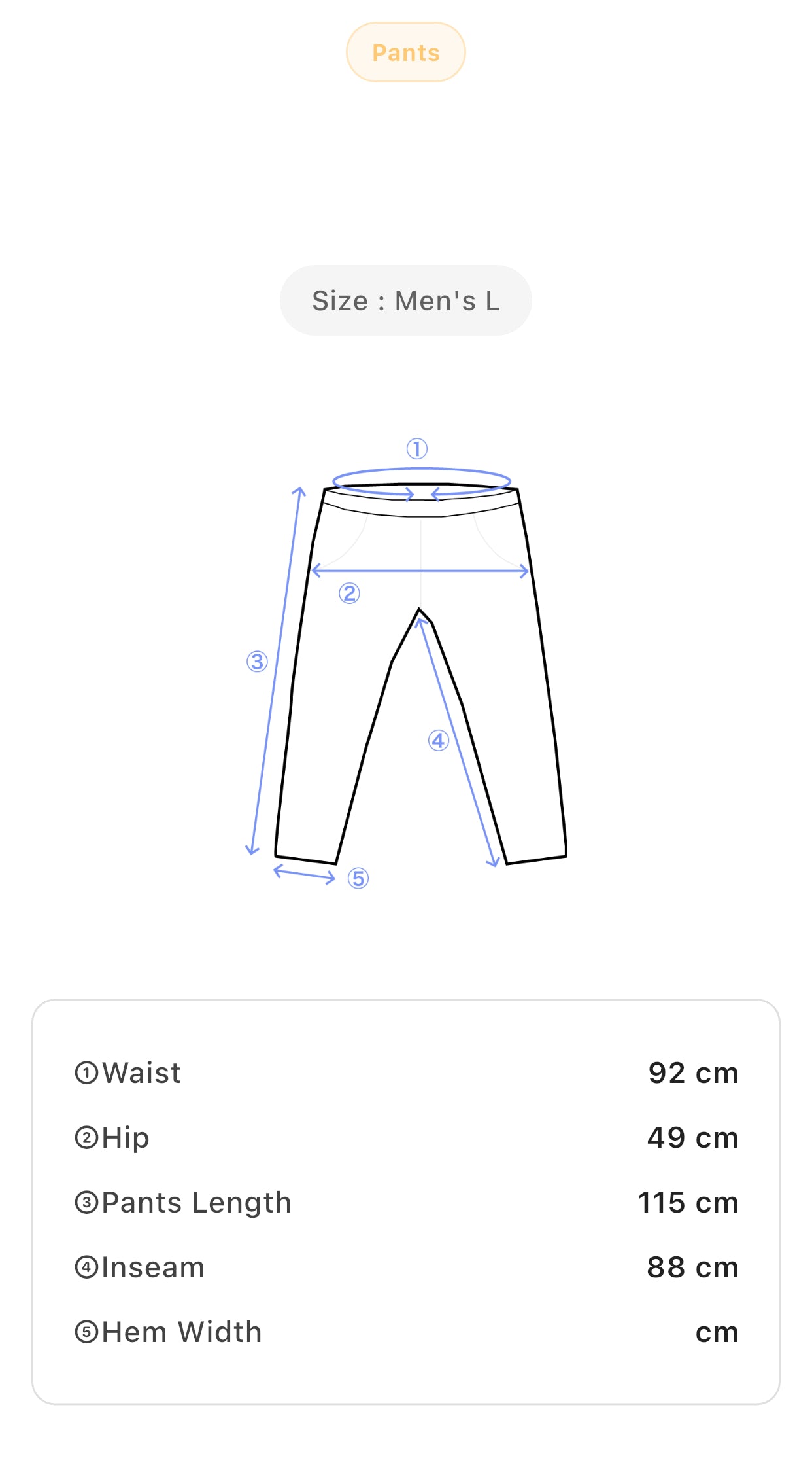 Size: Men's L; Waist 92 cm; Hip 49 cm; Length 115 cm; Inseam 88 cm
