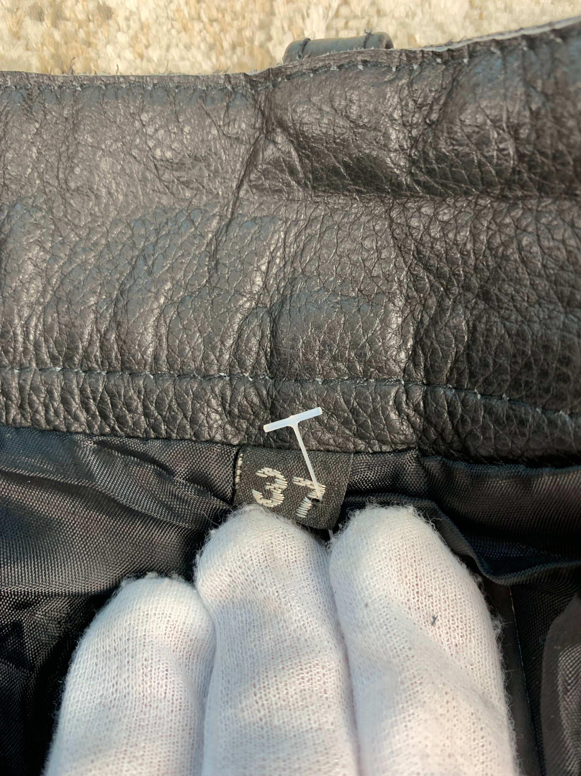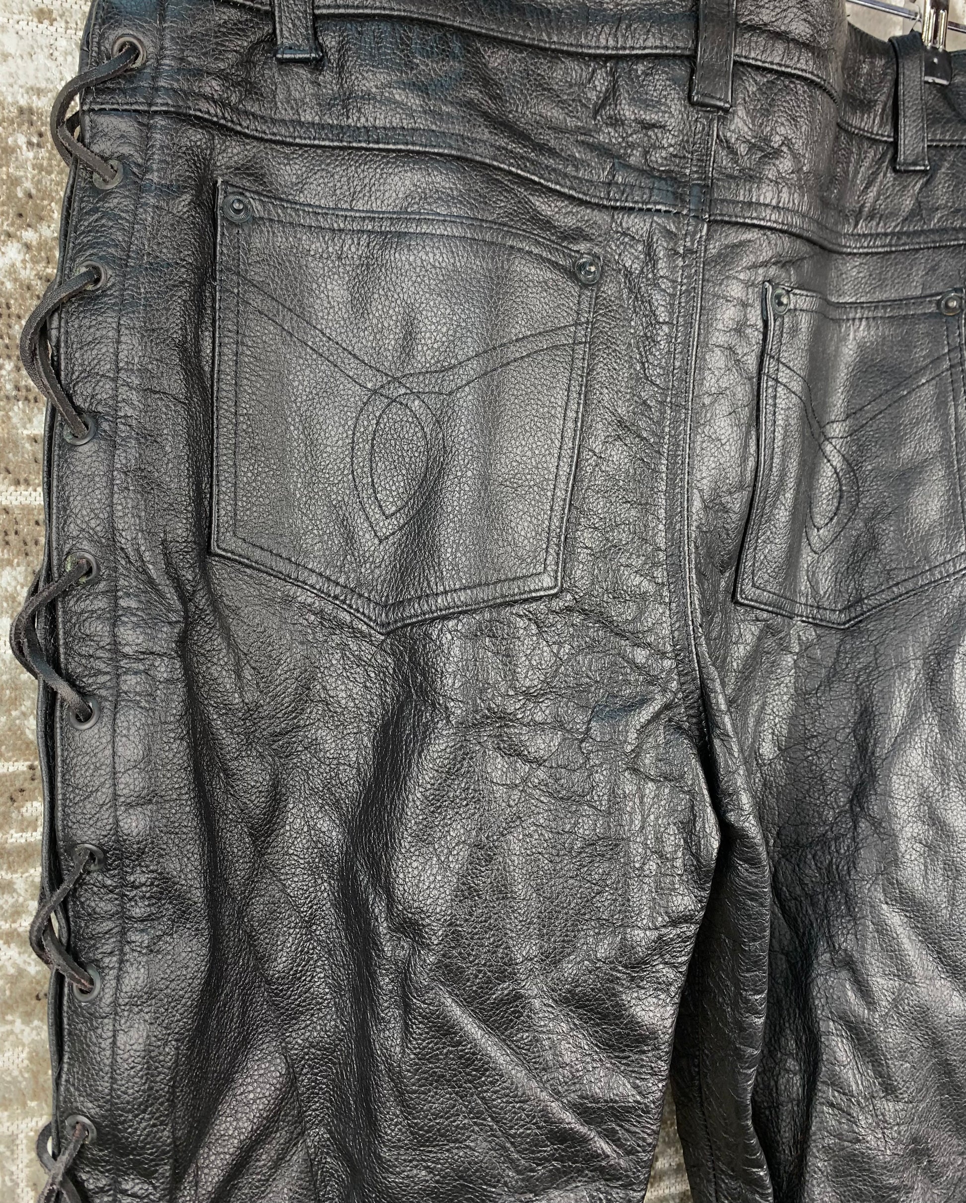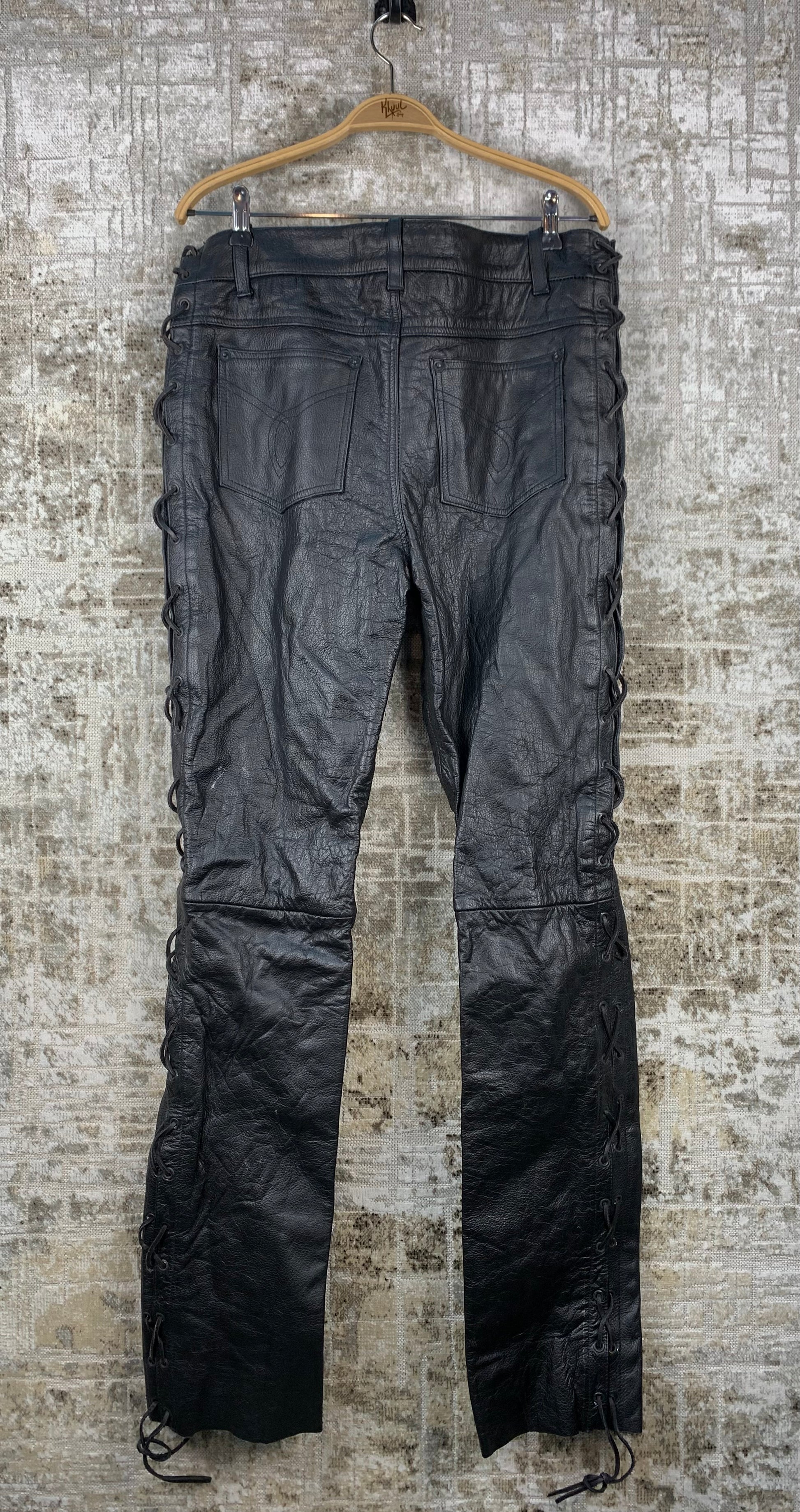 Mens Vintage Euro SB1 Stars Black Leather Pants Laced Up Biker Trousers Gothic Punk Rock Style Straight Leg Heavyweight Size L