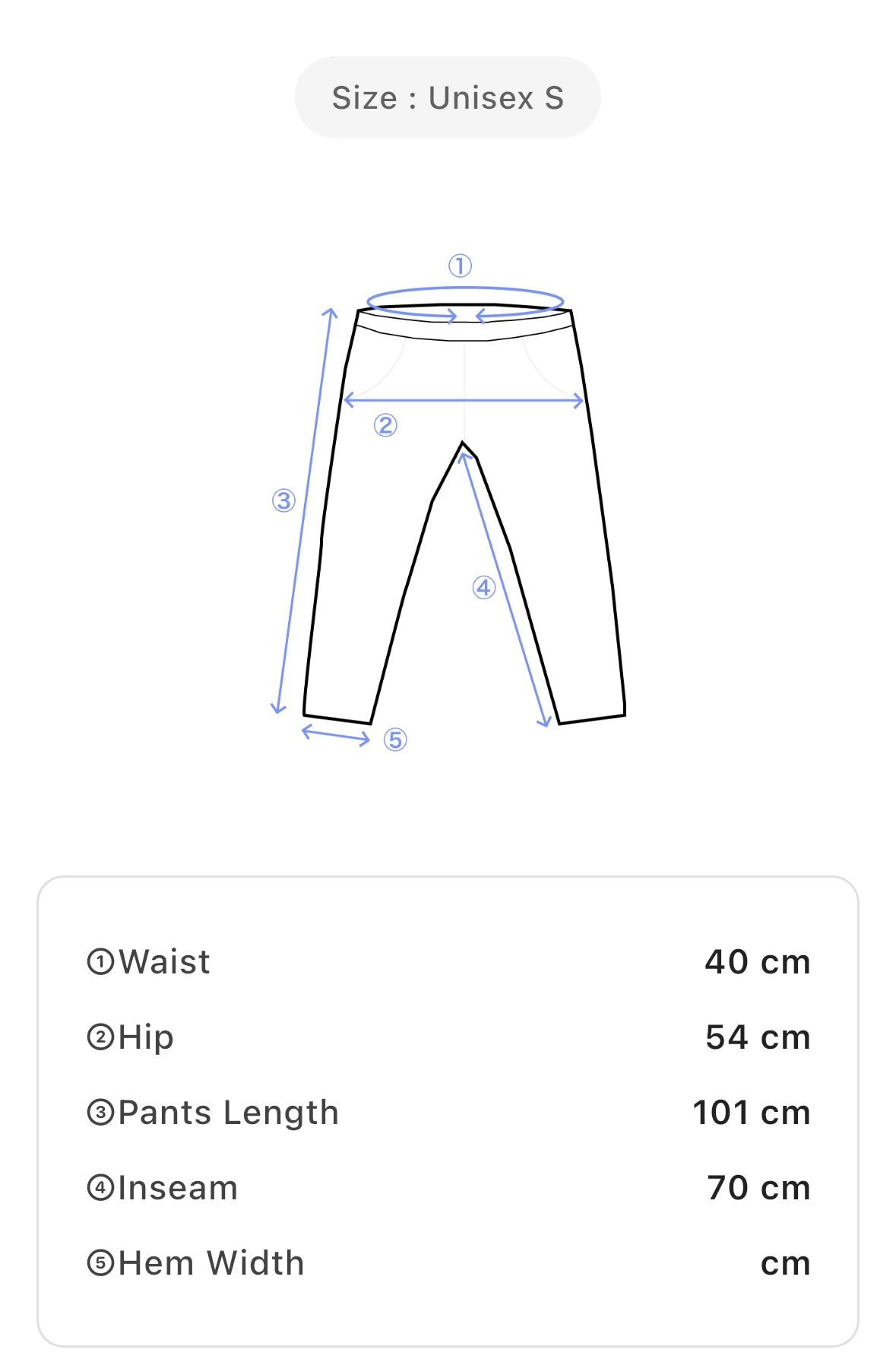 Size: Men S — Waist: 40 cm, Hip: 54 cm, Length: 101 cm, Inseam: 70 cm