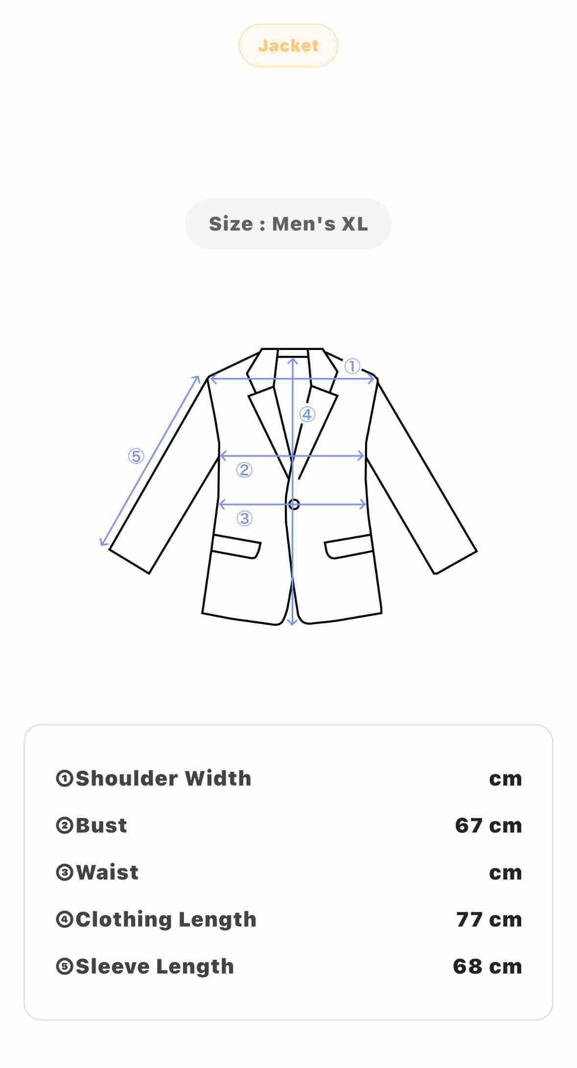 Size: Men's XL – Bust 67 cm; Clothing length 77 cm; Sleeve length 68 cm